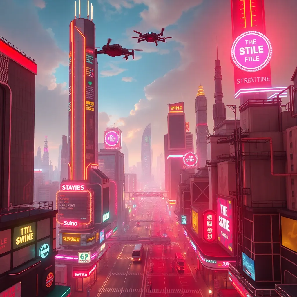 Create a futuristic cityscape with towering skyscrapers, neon lights, and a bustling streetscape. Incorporate a flying car or drone soaring above the city. The atmosphere should be vibrant and energetic, with a mix of modern and retro architectural styles. Use a warm color palette with bright accents.