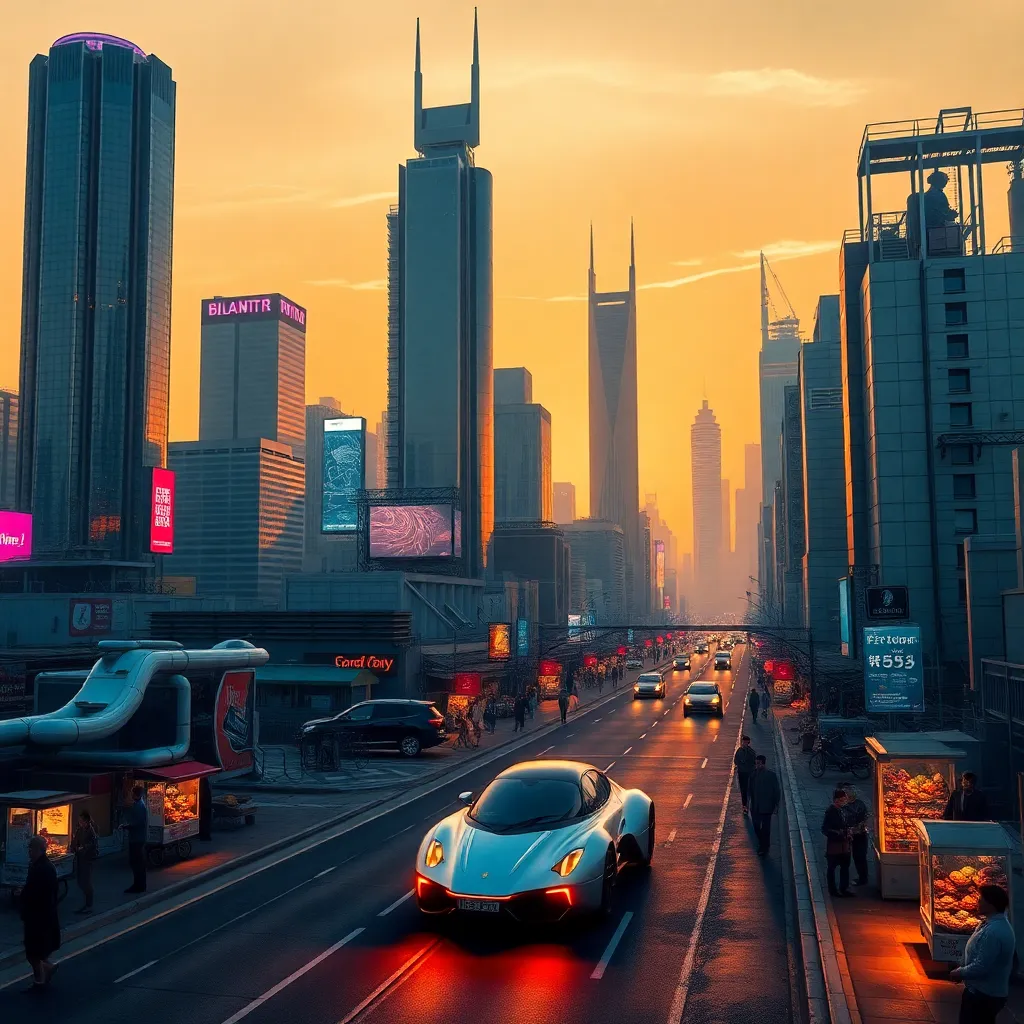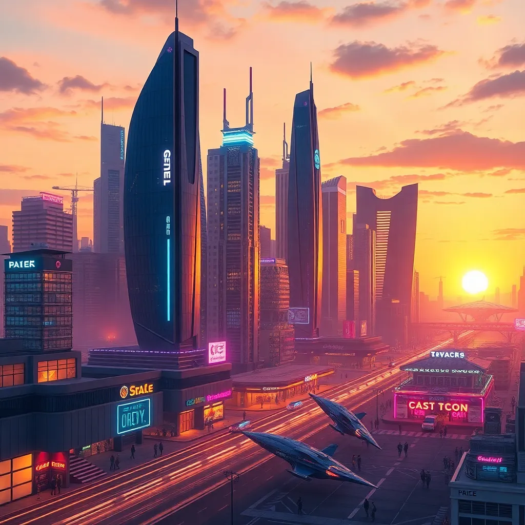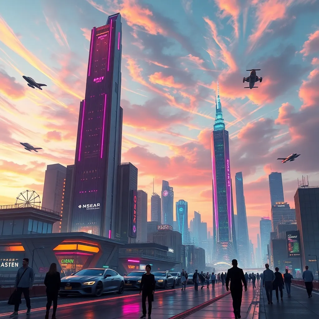 Create an imaginative futuristic cityscape at sunset, with towering skyscrapers, flying cars, and humans in sleek attire. Incorporate vibrant colors, neon lights, and a dramatic sky with swirling clouds. The city should be bustling with activity, with people going about their daily lives amidst the futuristic backdrop.