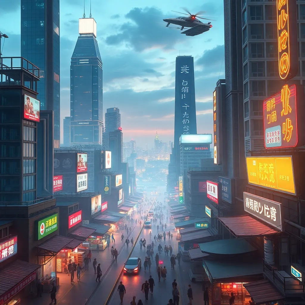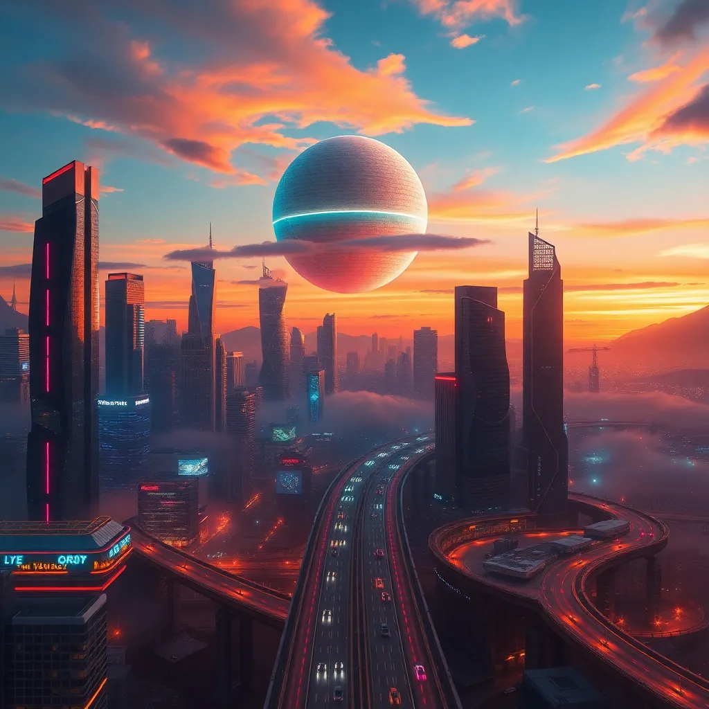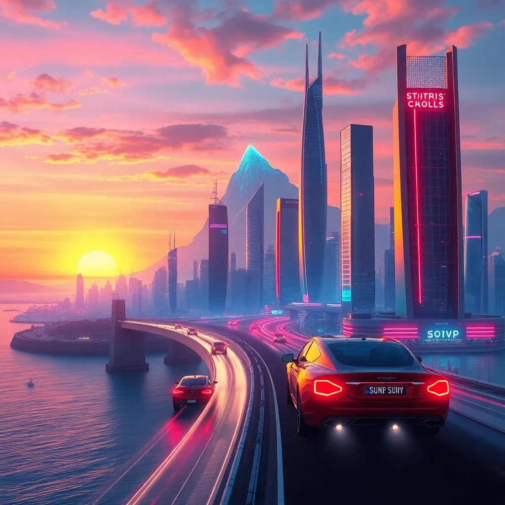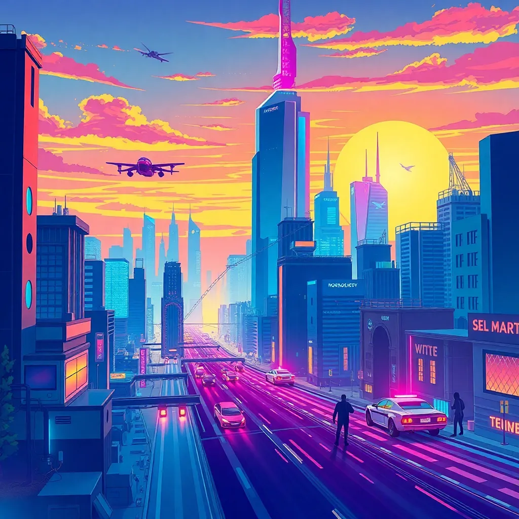 Create an imaginative futuristic cityscape at sunset, with towering skyscrapers, flying cars, and humans in sleek attire. Incorporate vibrant colors, neon lights, and a dramatic sky with swirling clouds. The city should be bustling with activity, with people going about their daily lives amidst the futuristic backdrop.