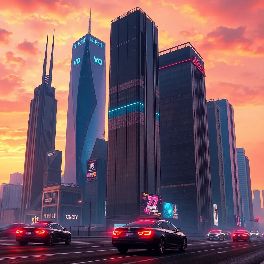 Create a futuristic cityscape at sunset, with sleek skyscrapers, flying cars, and a vibrant atmosphere. The sky should be a warm orange-yellow hue, with clouds tinted pink and purple. Incorporate neon lights and holographic advertisements to give the scene a futuristic feel. Use bold, vibrant colors and high-contrast textures.