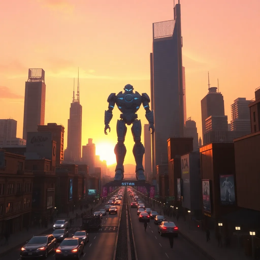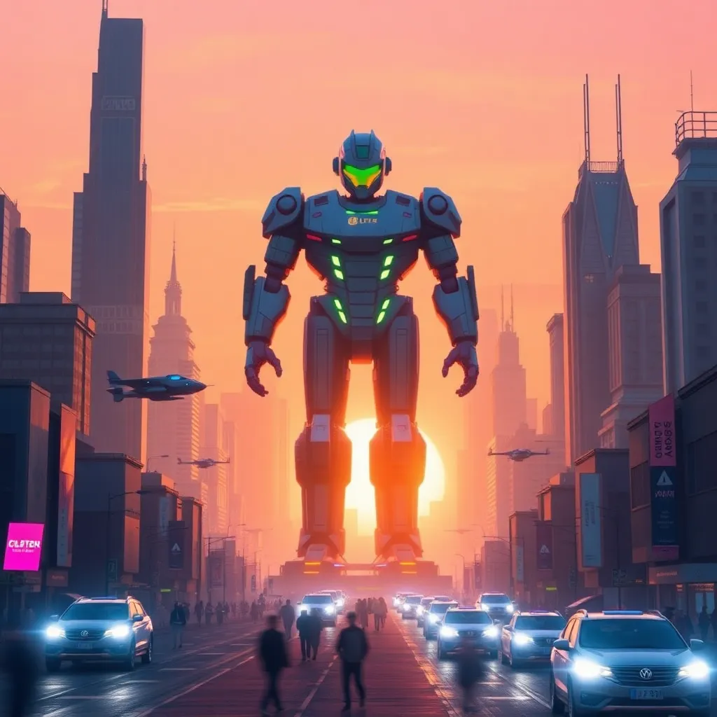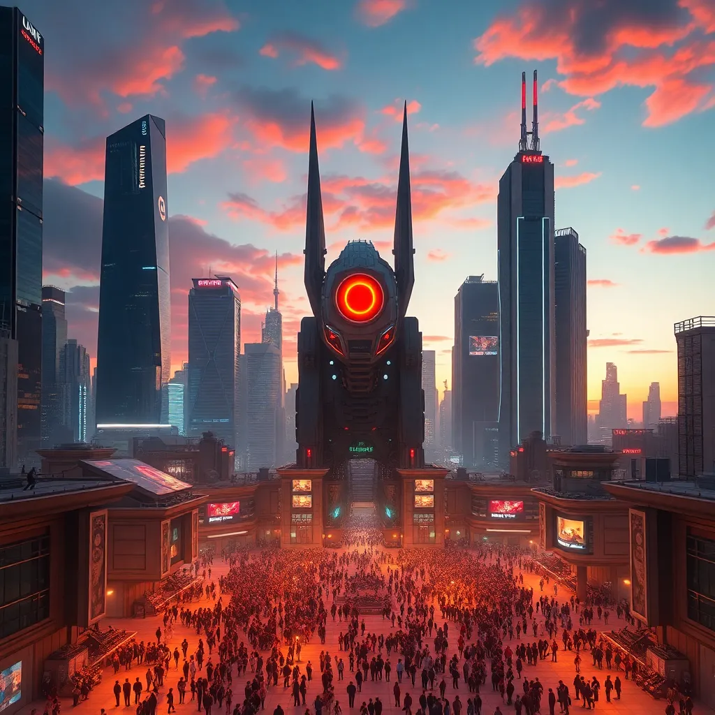 Create an futuristic cityscape at sunset, with sleek skyscrapers, neon lights, and a vast city square filled with people. Incorporate a giant robot in the background, with a glowing red eye. The atmosphere should be vibrant and energetic, with a sense of technology and innovation. Generate a high-resolution image.