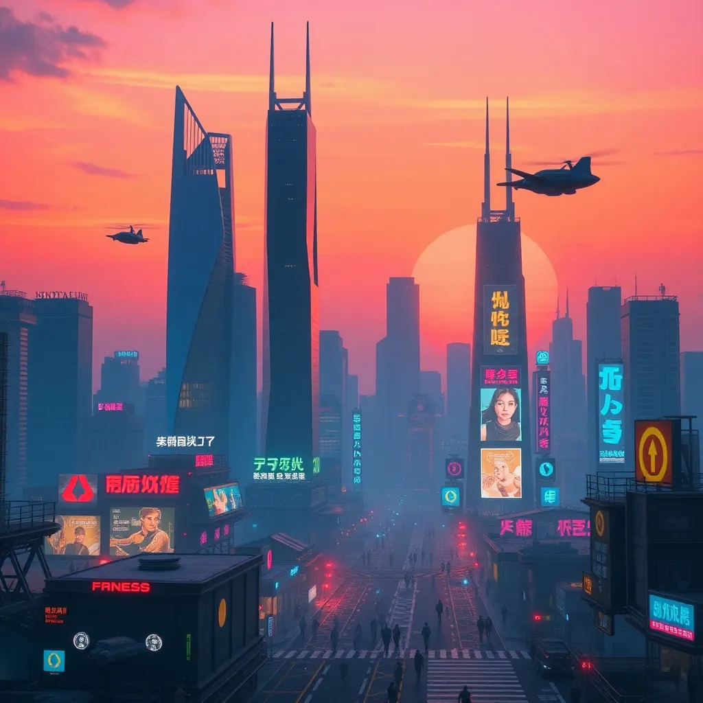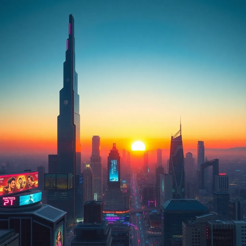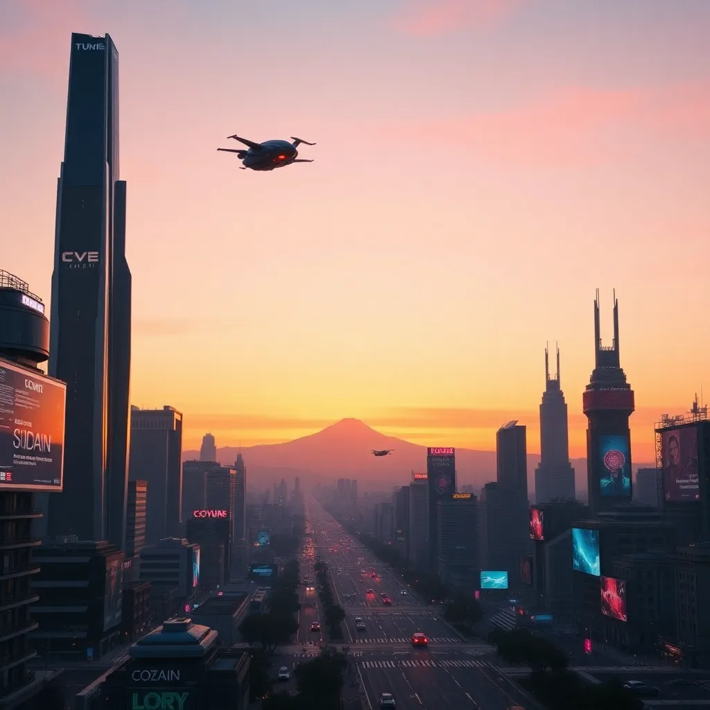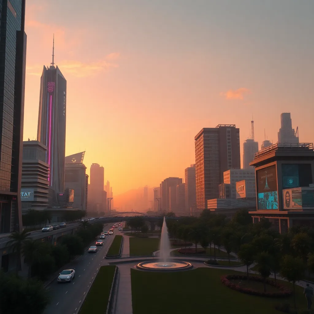Create a futuristic cityscape at sunset. Include a sleek skyscraper with neon lights, a busy street with hovercars, and a beautiful park with a fountain. The sky should be a warm orange-pink color with a few wispy clouds. Incorporate subtle AI-generated details like holographic advertisements and robotic pedestrians.