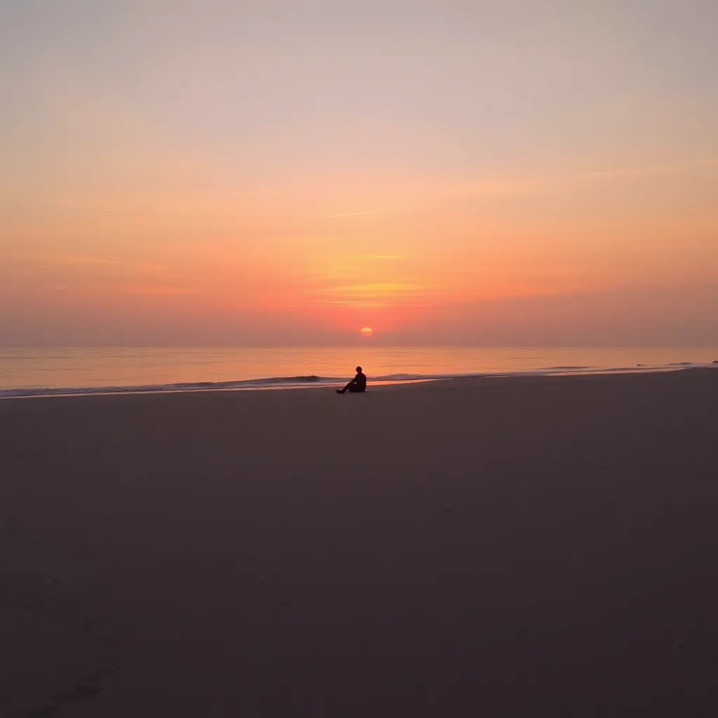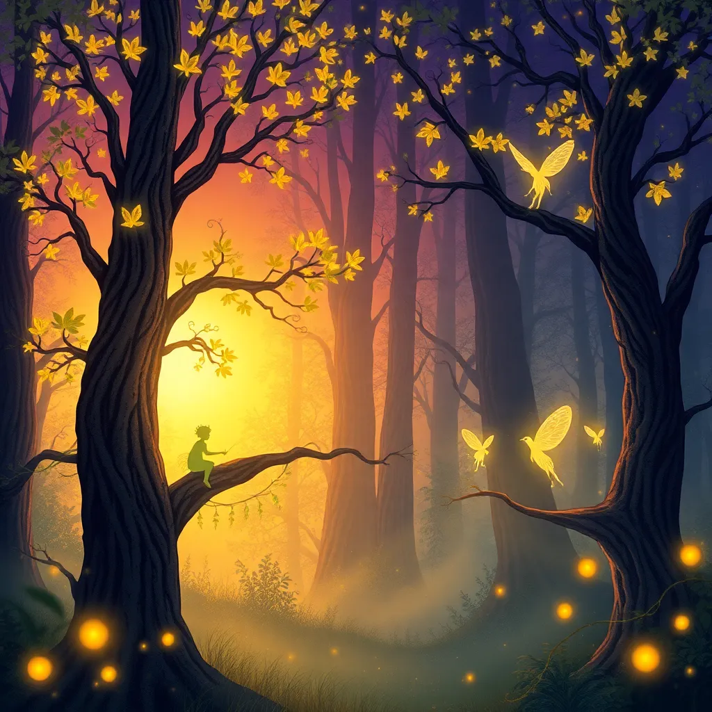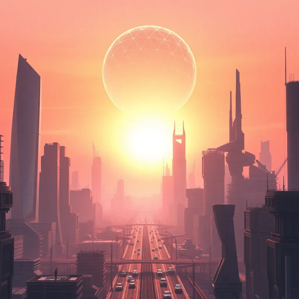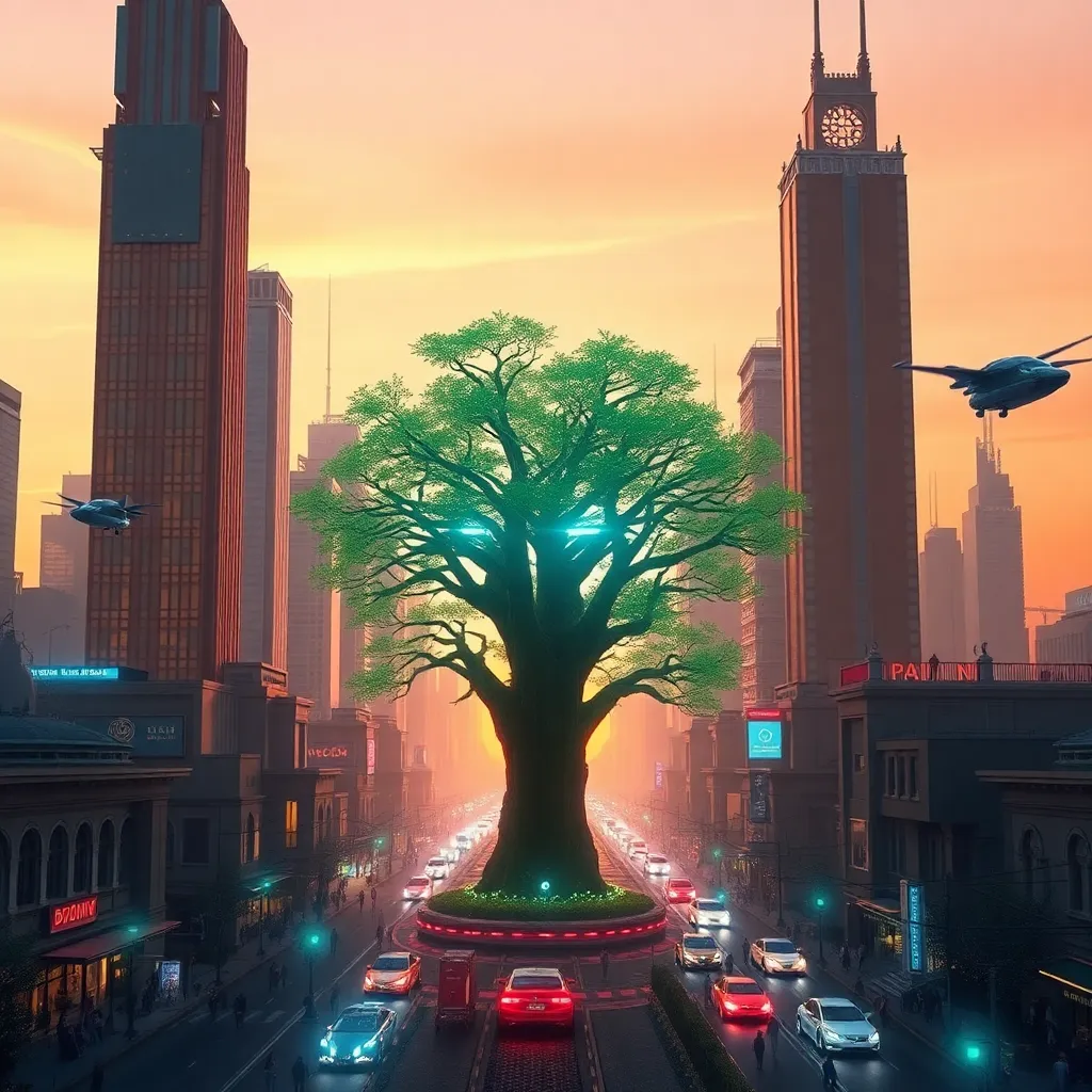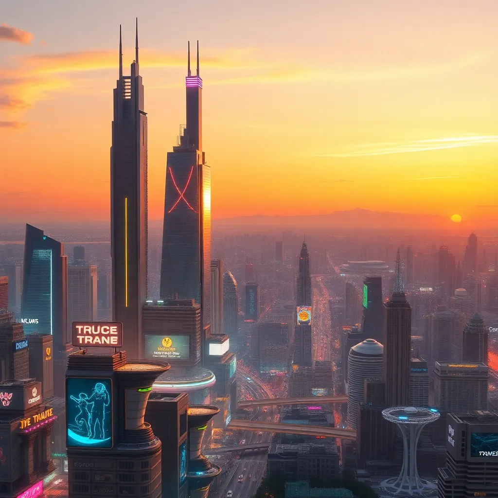 Create a futuristic cityscape at sunset. Include a sleek skyscraper with neon lights, a busy street with hovercars, and a beautiful park with a fountain. The sky should be a warm orange-pink color with a few wispy clouds. Incorporate subtle AI-generated details like holographic advertisements and robotic pedestrians.