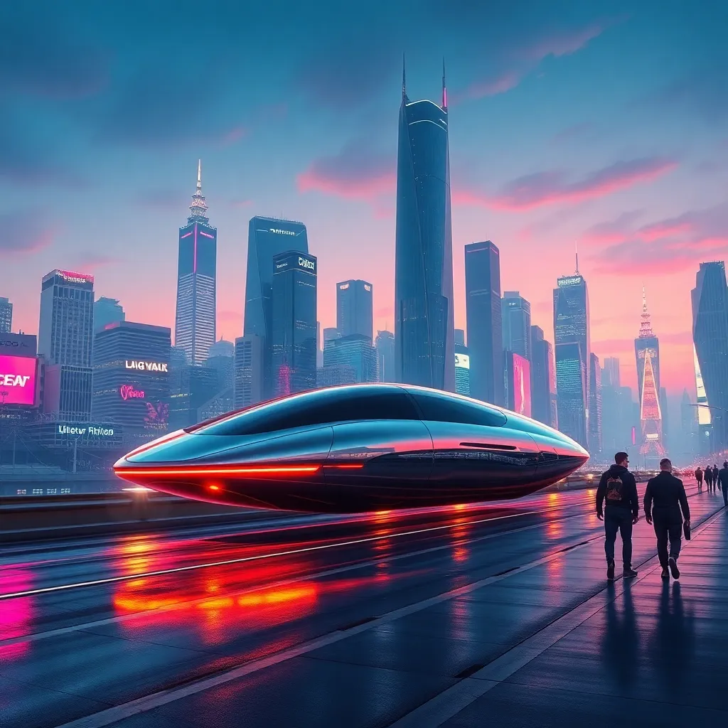 Create a futuristic cityscape at dusk, with towering skyscrapers and neon lights reflecting off the wet pavement. Incorporate a sleek, silver hovercar hovering above the street, and a group of people in futuristic attire walking towards the city's central hub. Use vibrant colors and sharp lines to capture the sense of innovation and progress.