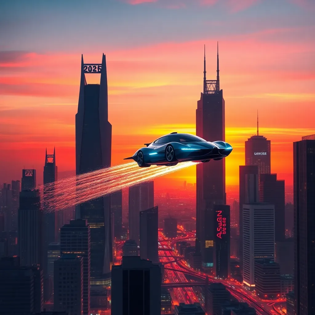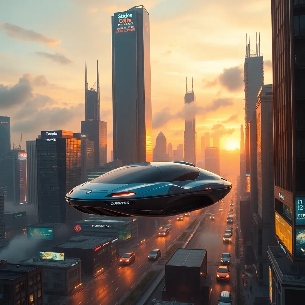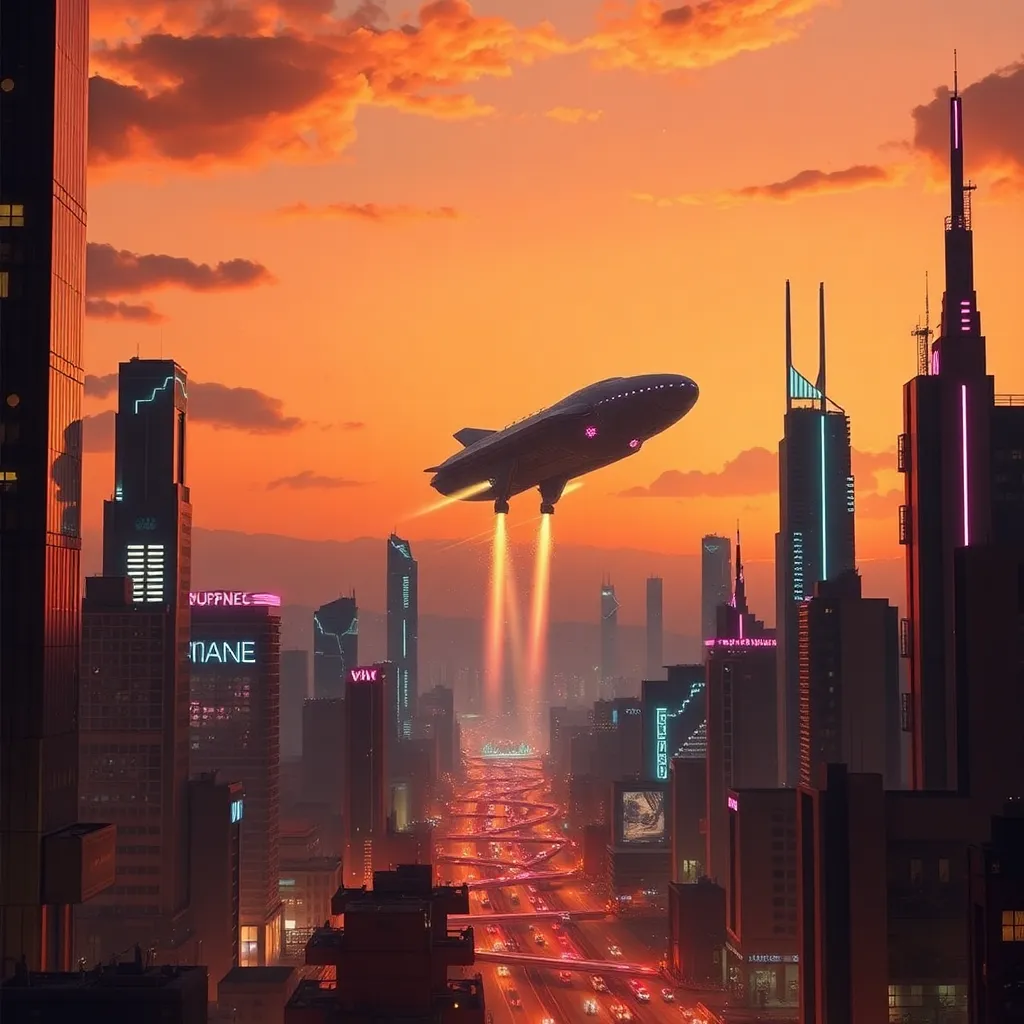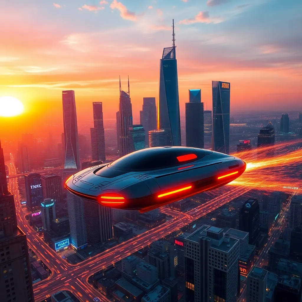 Create a futuristic cityscape at sunset with towering skyscrapers, neon lights, and a sprawling metropolis. Incorporate a sleek, high-tech hovercar zipping through the air, with a bright orange glow and a trail of sparks behind it. Use a warm, vibrant color palette with a hint of blue and purple hues.