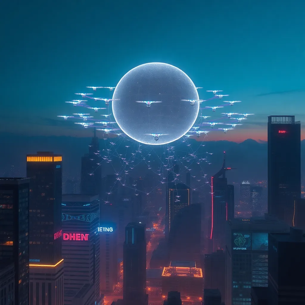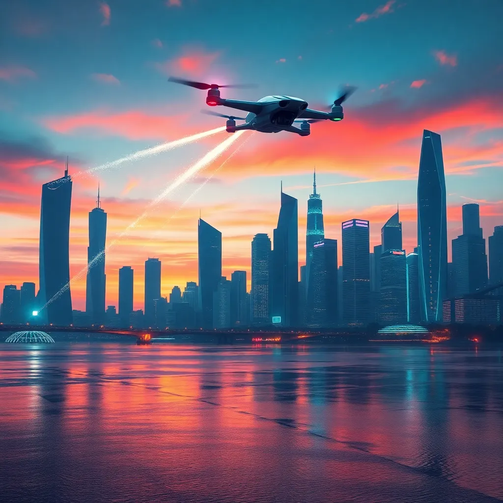 Create a futuristic cityscape at sunset, with sleek skyscrapers, glowing neon lights, and a vast, serene lake in the foreground. Incorporate a majestic flying drone hovering above the city, leaving a trail of sparkling sparks. Use vibrant colors and sharp details to bring this futuristic scene to life.