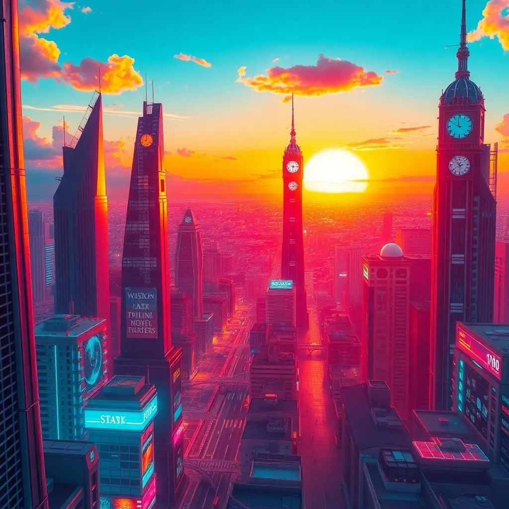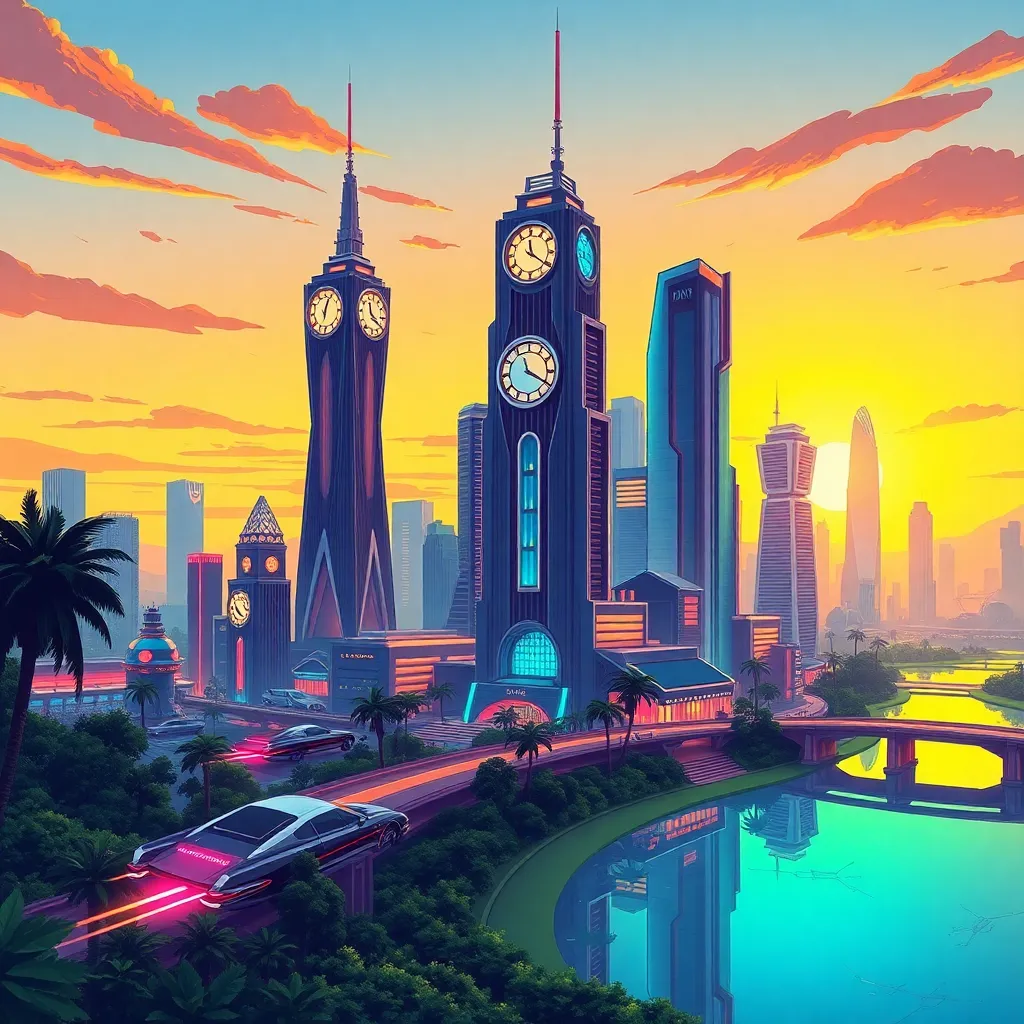 Create an illustration of a futuristic cityscape at sunset, with towering skyscrapers, sleek flying cars, and vibrant neon lights. Incorporate a prominent clock tower with a glowing face, surrounded by lush greenery and a serene lake. Use bold lines, vibrant colors, and a sense of depth and dimensionality.