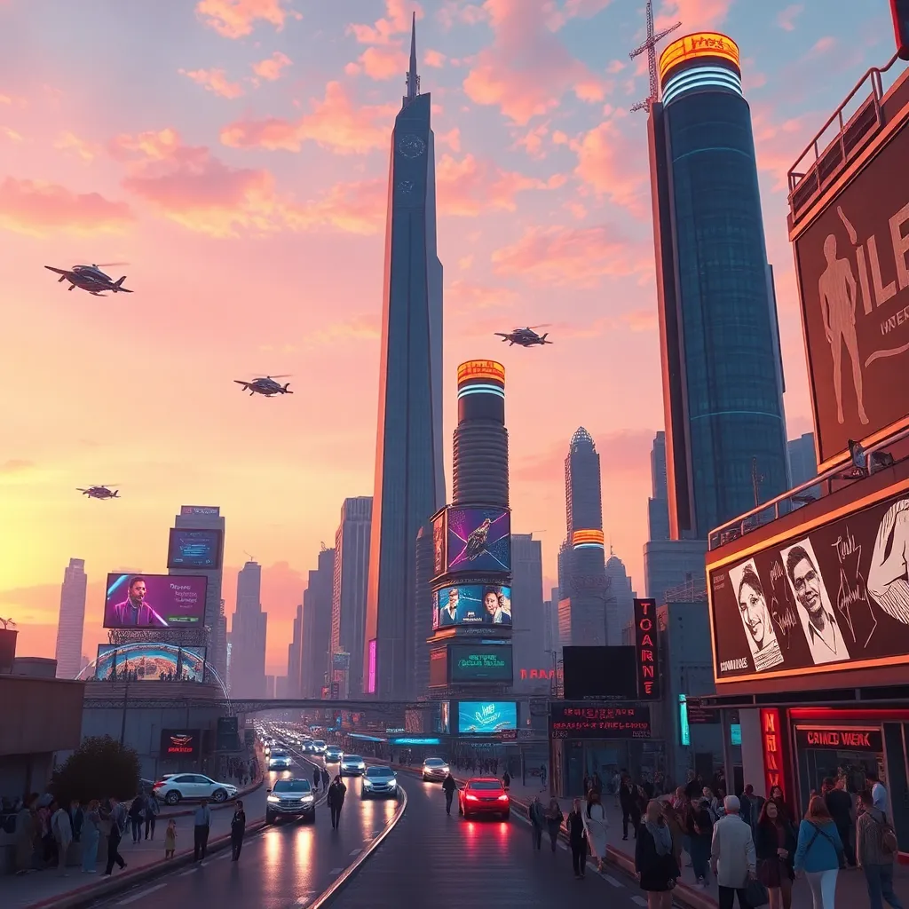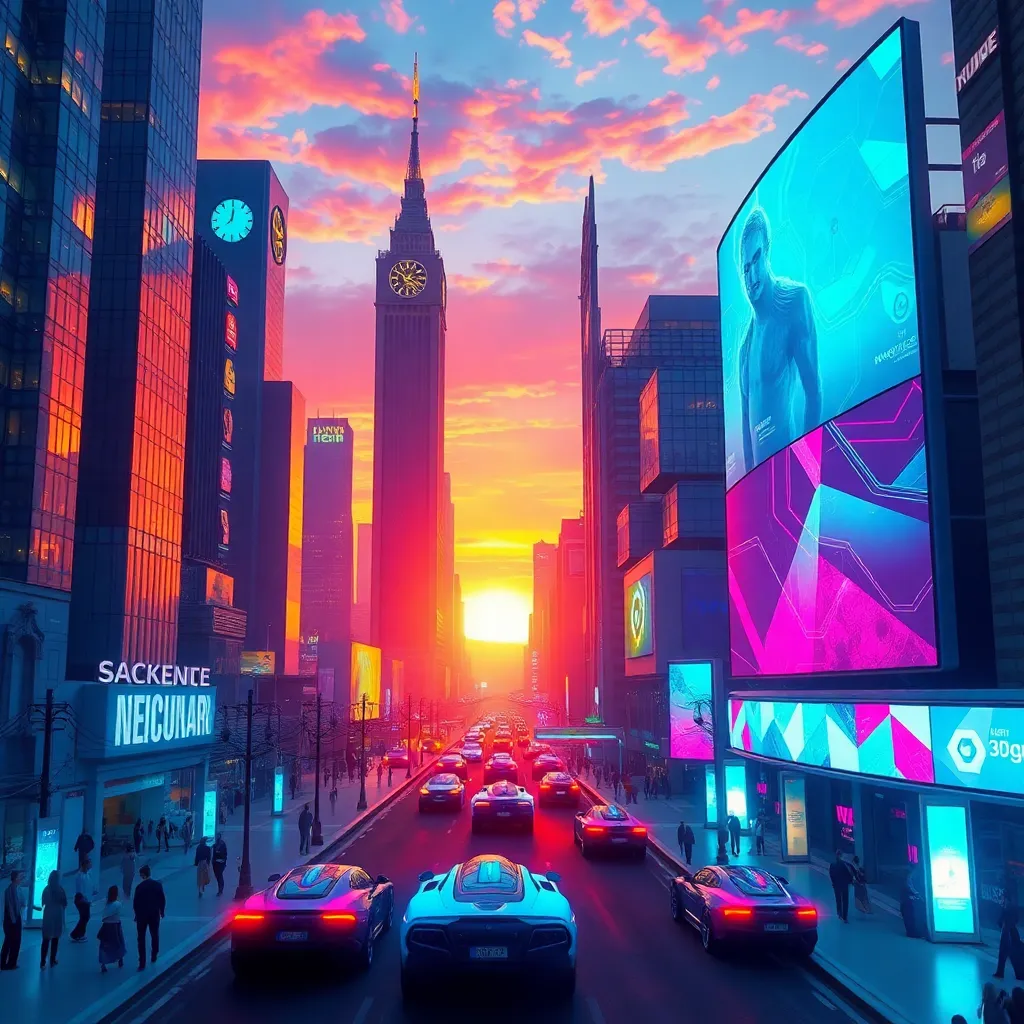 Create a futuristic cityscape at sunset with sleek skyscrapers, neon lights, and a bustling street filled with people and hovercars. Incorporate a prominent clock tower and a giant digital billboard displaying a futuristic advertisement. Use vibrant colors and detailed textures to bring the scene to life.