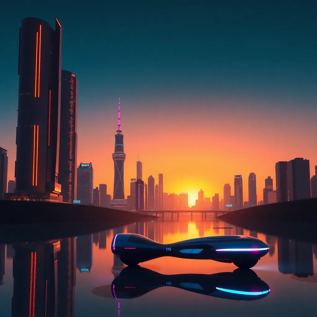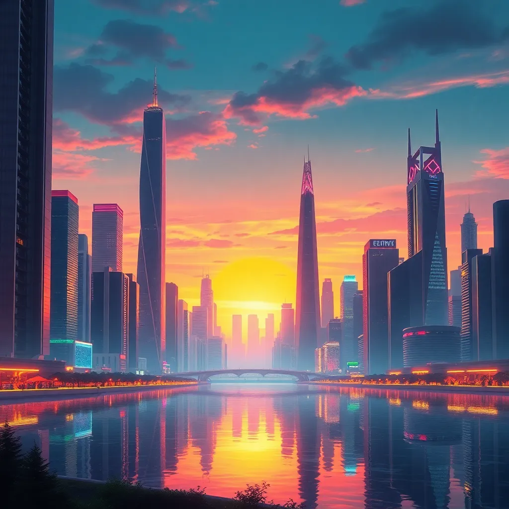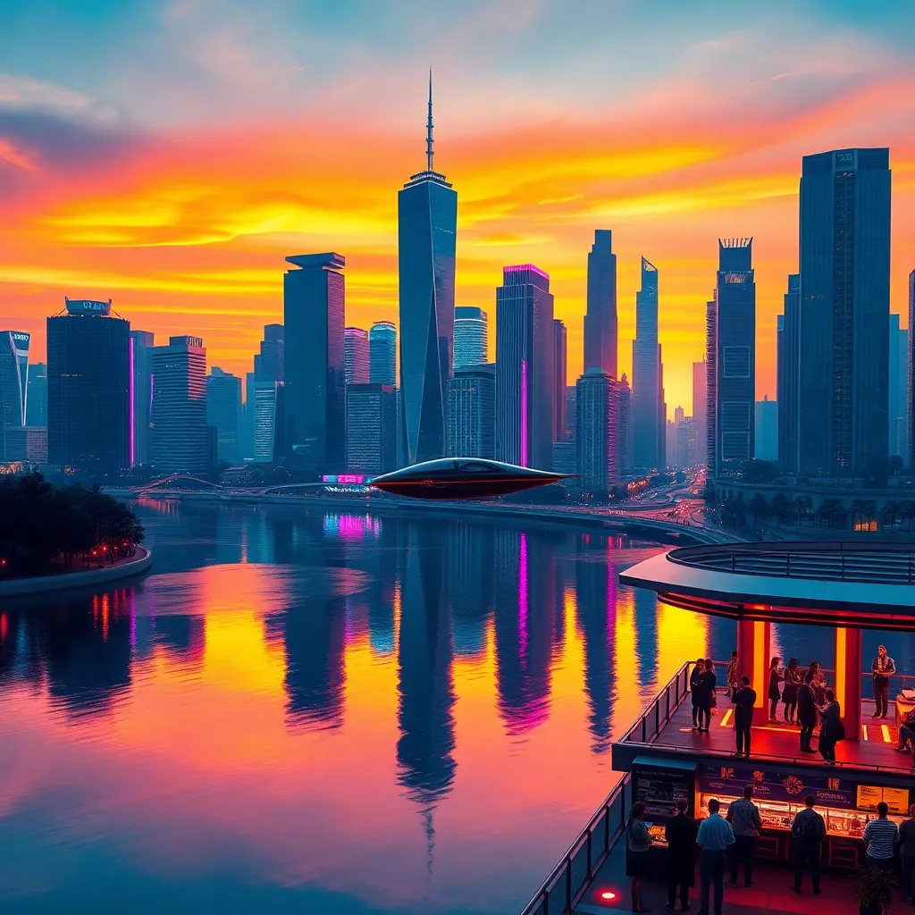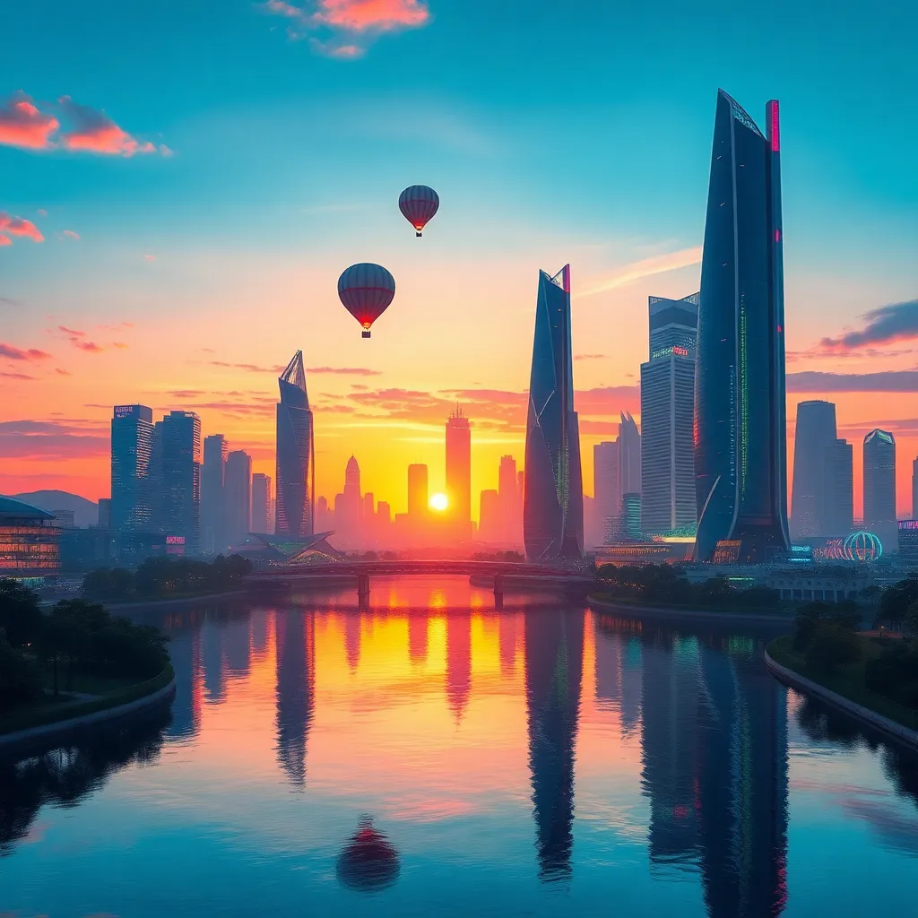 Create a futuristic cityscape at sunset, with sleek skyscrapers and neon lights reflecting off a serene lake. Incorporate a few hot air balloons drifting lazily overhead. The atmosphere should be vibrant and alive, with a hint of magic and wonder. Use a blend of warm and cool colors to capture the moment.