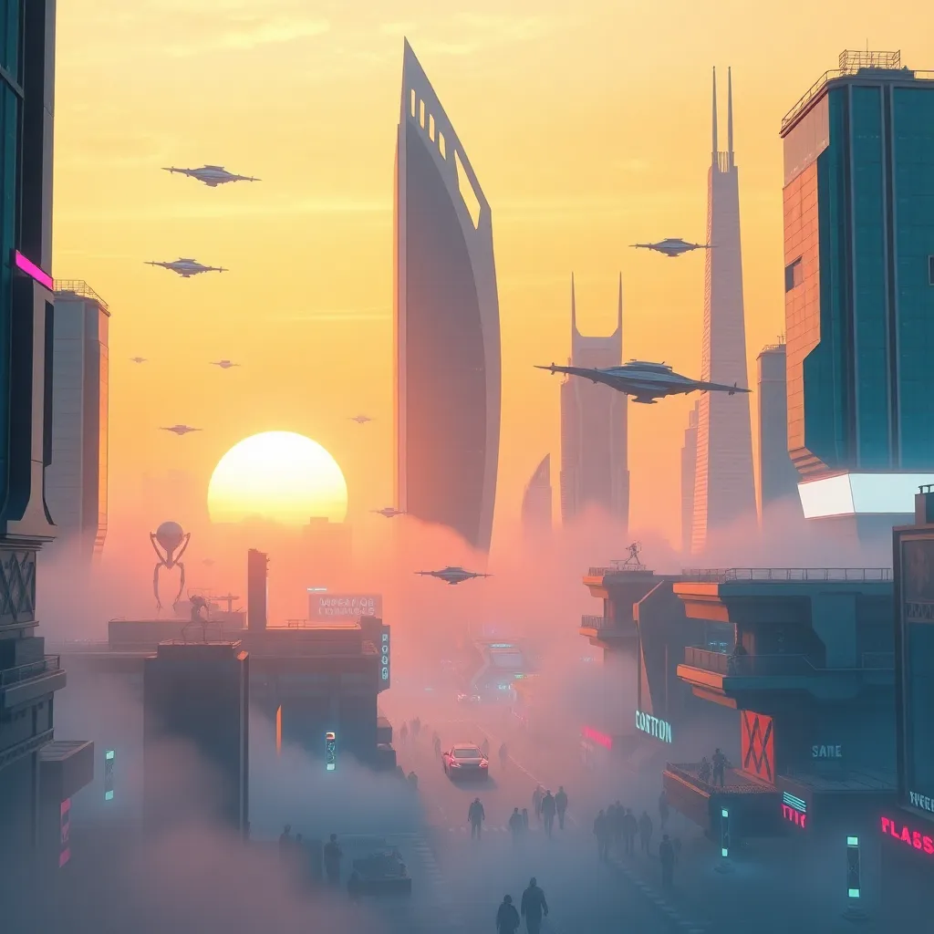 Create an AI-generated image of a futuristic cityscape at sunset, with sleek skyscrapers, flying cars, and a vibrant atmosphere. Incorporate neon lights, misty fog, and a bright orange-yellow sky. The city should be bustling with people, robots, and alien species, with a sense of excitement and adventure.