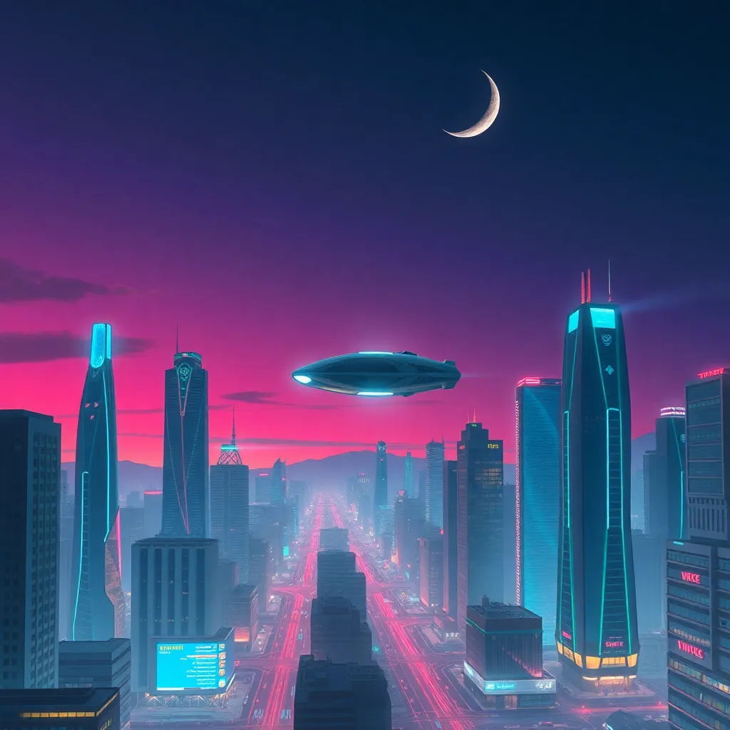 Create a futuristic cityscape at sunset, with towering skyscrapers, sleek hovercars, and a vibrant cityscape. Incorporate neon lights, holographic advertisements, and a sprawling metropolis with a distant moonrise in the background. The atmosphere should be dynamic, with a sense of energy and movement.