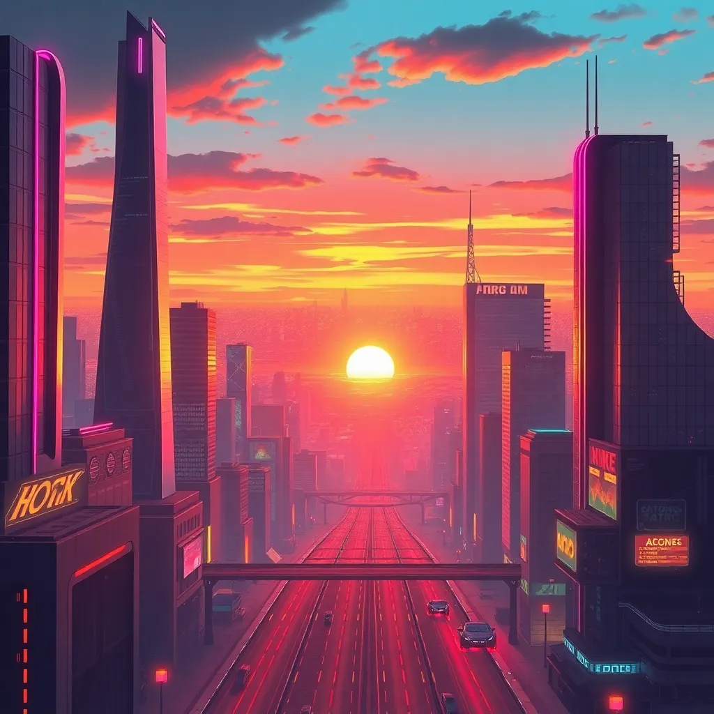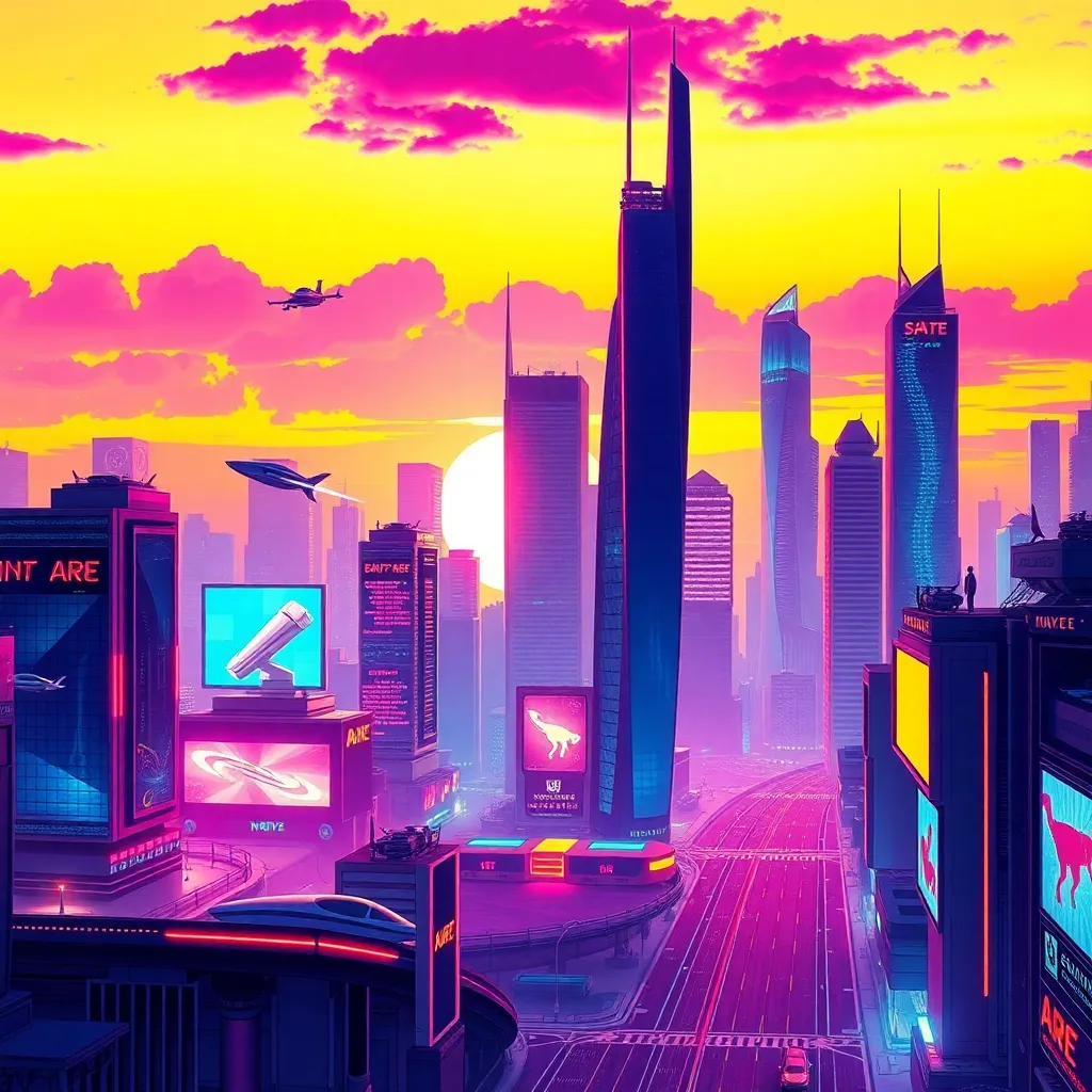 Create a futuristic cityscape at sunset, with sleek skyscrapers, vibrant neon lights, and a sprawling metropolis in the distance. Incorporate a sense of movement and energy, with flying cars and hoverboards zipping through the air. Use a warm color palette to capture the cozy atmosphere of the setting sun.