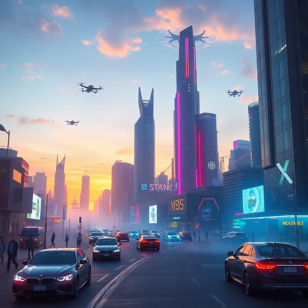 Create an futuristic cityscape at sunset with towering skyscrapers, sleek cars, and pedestrians walking along the sidewalks. Incorporate vibrant colors and neon lights. The city should be surrounded by a misty atmosphere, with a hint of sci-fi elements like holographic advertisements and flying drones.