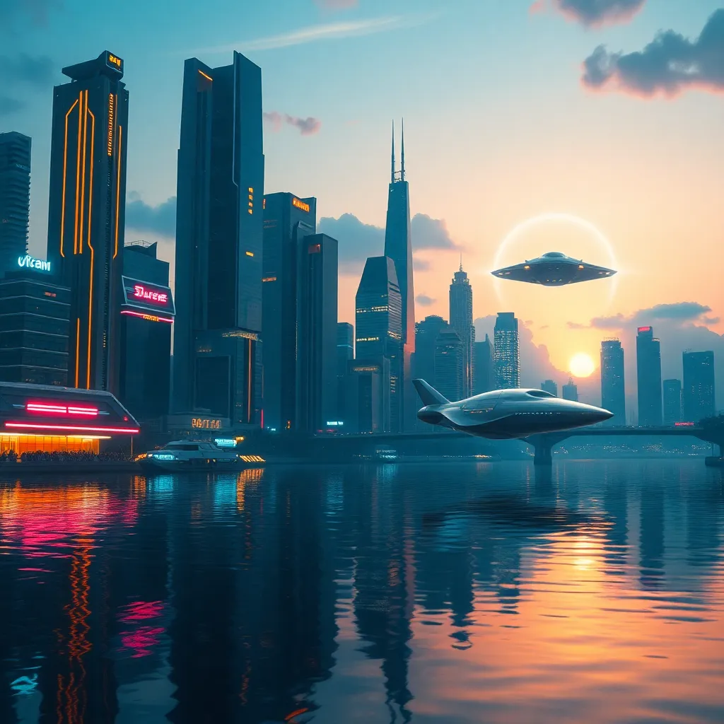 Create a futuristic cityscape at sunset, with towering skyscrapers and neon lights reflecting off the calm waters of a lake. Incorporate a sleek, silver spaceship landing in the distance, surrounded by a halo of light. The atmosphere should be vibrant and energetic, with a hint of mystery and adventure.