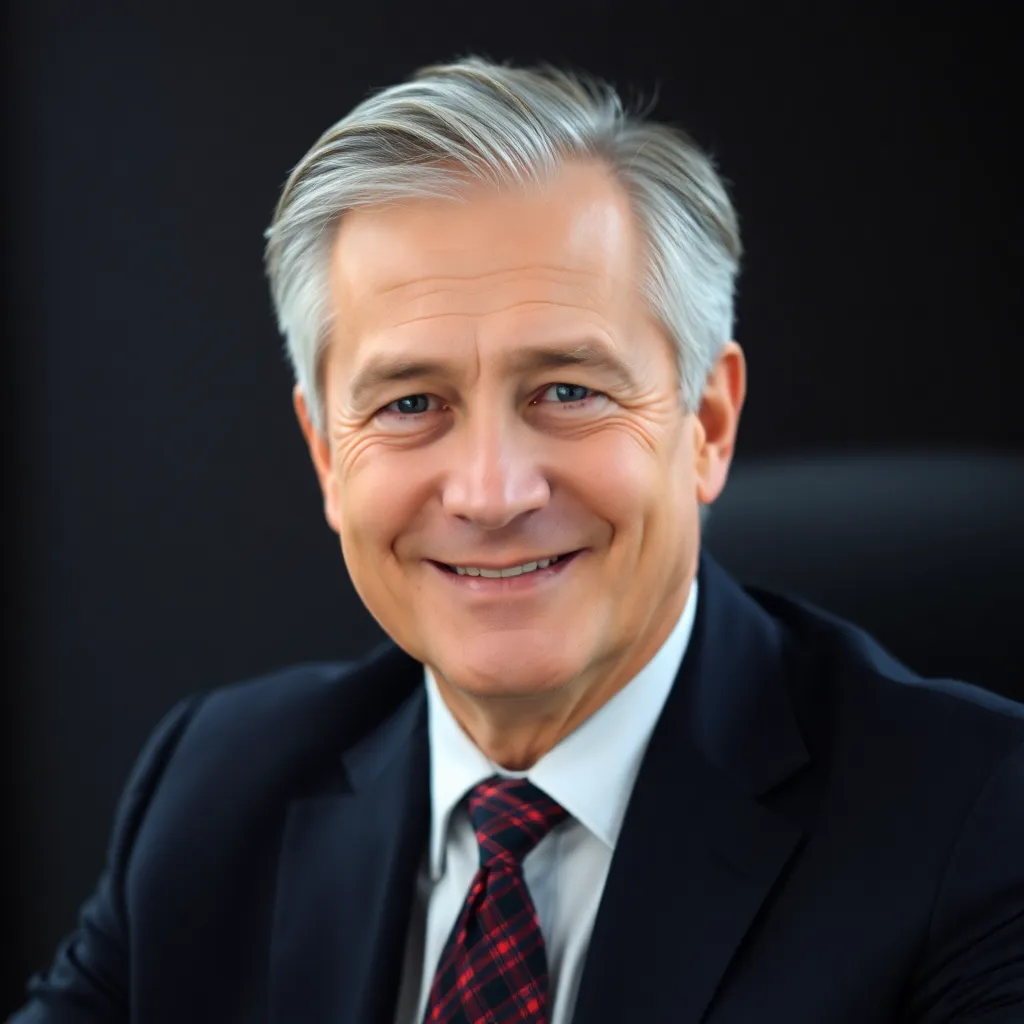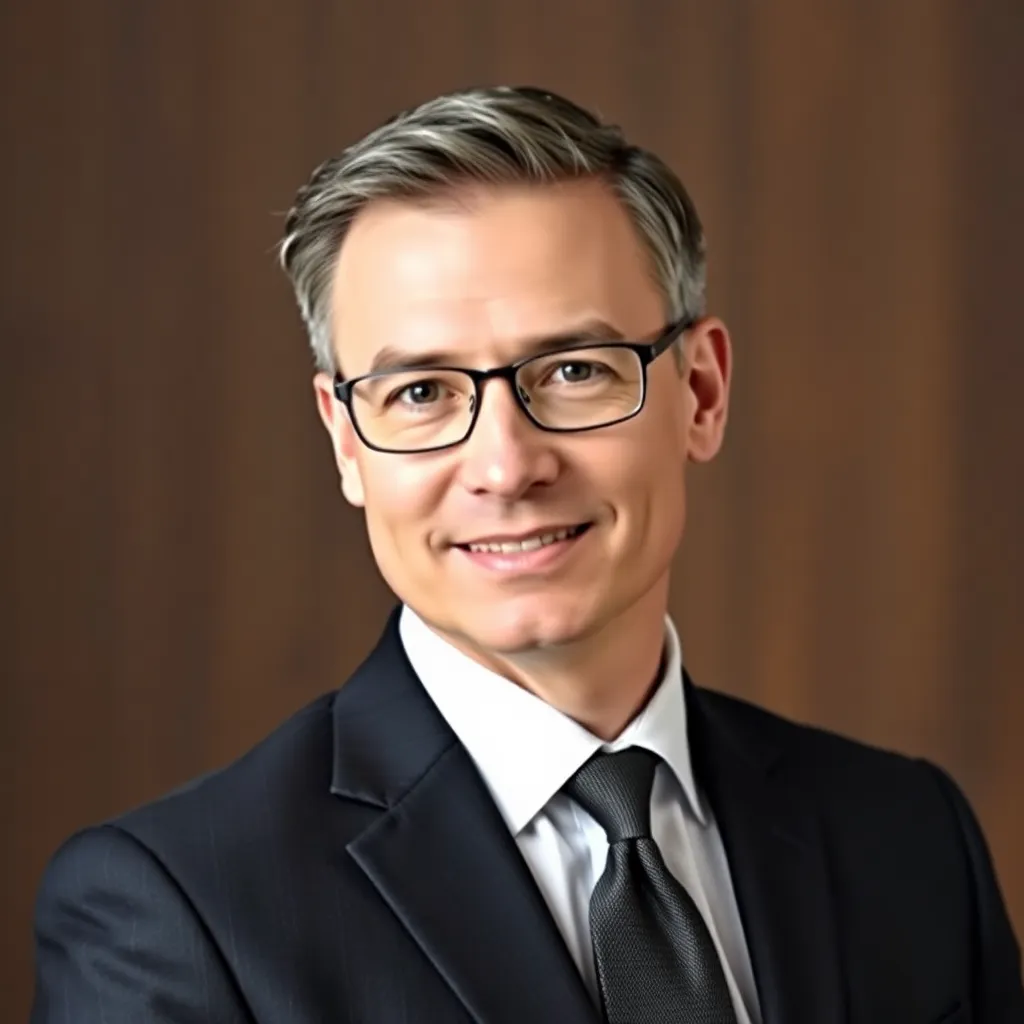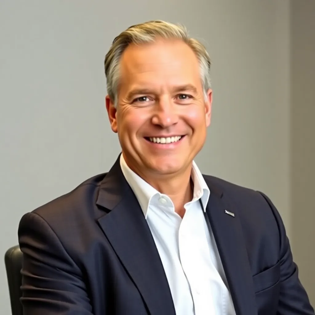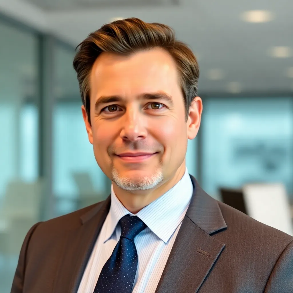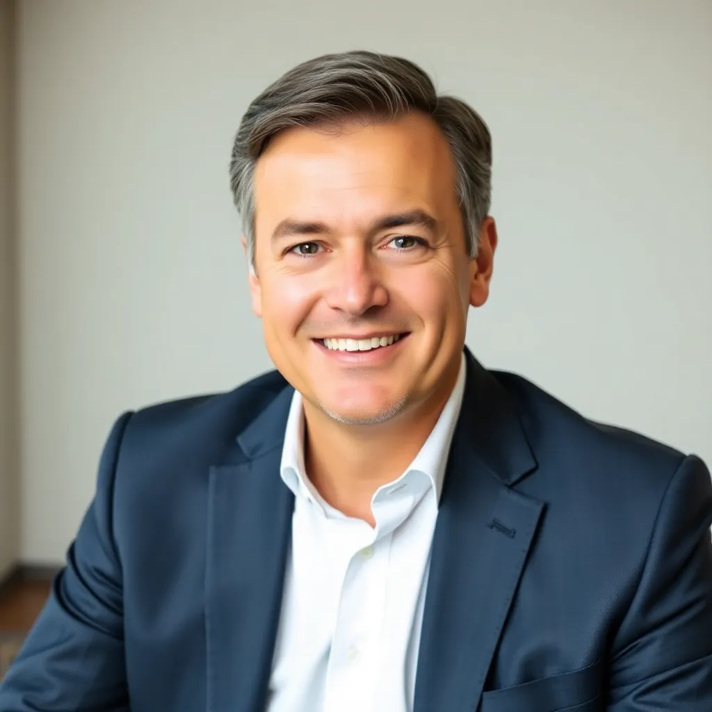 Create a professional lawyer headshot. The subject, a middle-aged man, sits in a neutral-toned office setting with a subtle background. He wears a classic suit, crisp white shirt, and a warm smile. His eyes are bright and engaging, conveying confidence and expertise. The lighting is soft and flattering.