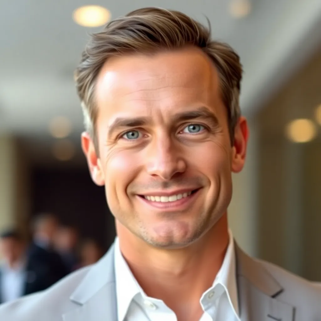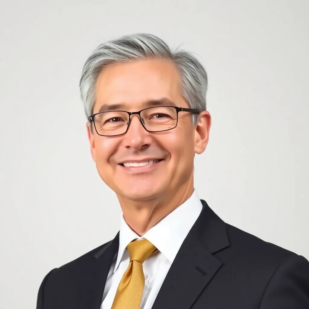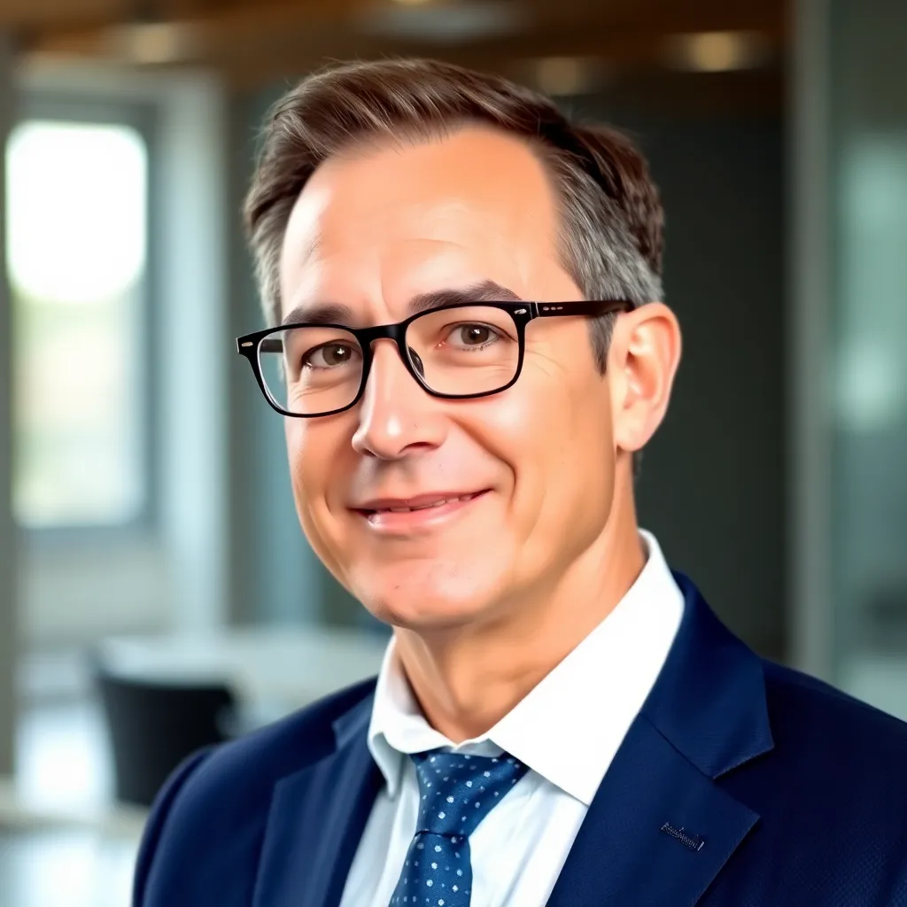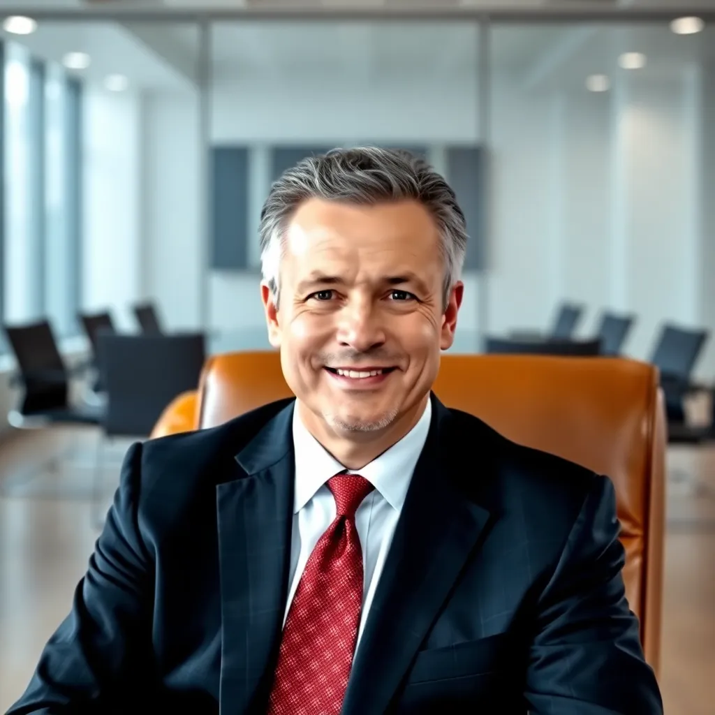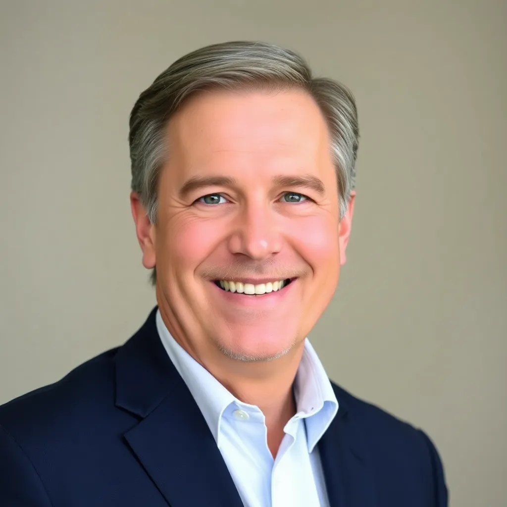 Create a professional lawyer headshot. The subject, a middle-aged man, sits in a neutral-toned office setting with a subtle background. He wears a classic suit, crisp white shirt, and a warm smile. His eyes are bright and engaging, conveying confidence and expertise. The lighting is soft and flattering.