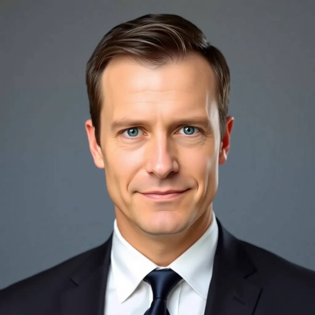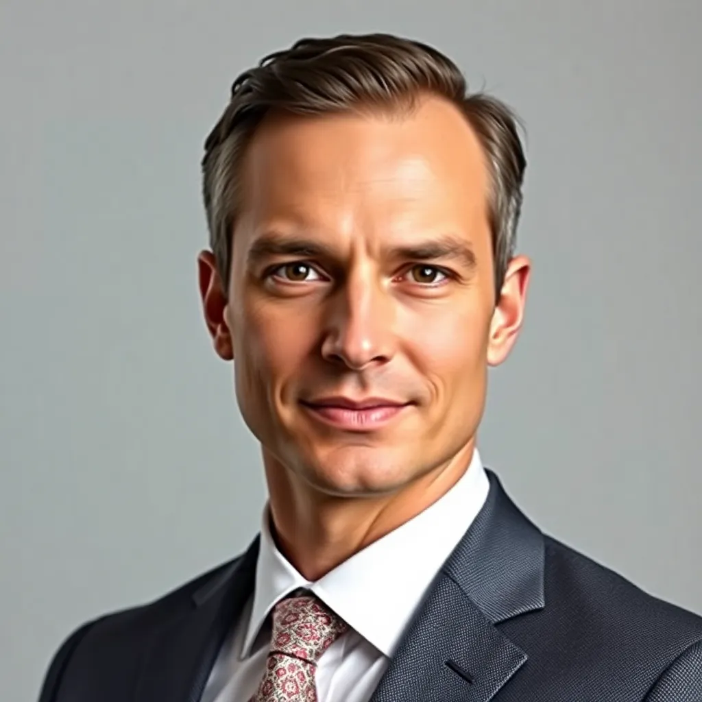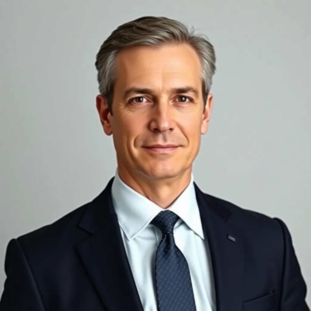 Create a professional headshot of a lawyer, aged 35-50, with a serious and confident expression. Wear a formal suit and tie, with a slight smile. Background should be a neutral or subtle gradient. Lighting should be soft and natural. Hair should be neatly trimmed and styled. Eyes should be sharp and focused.