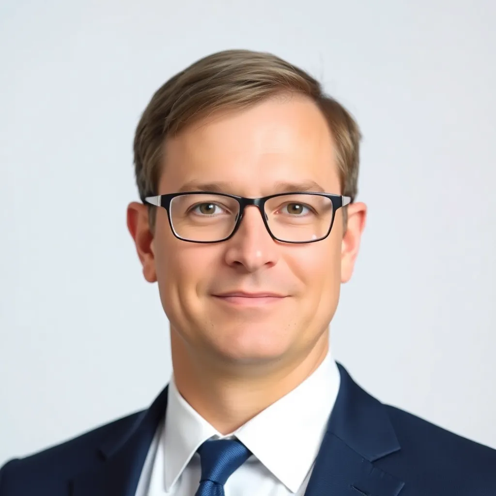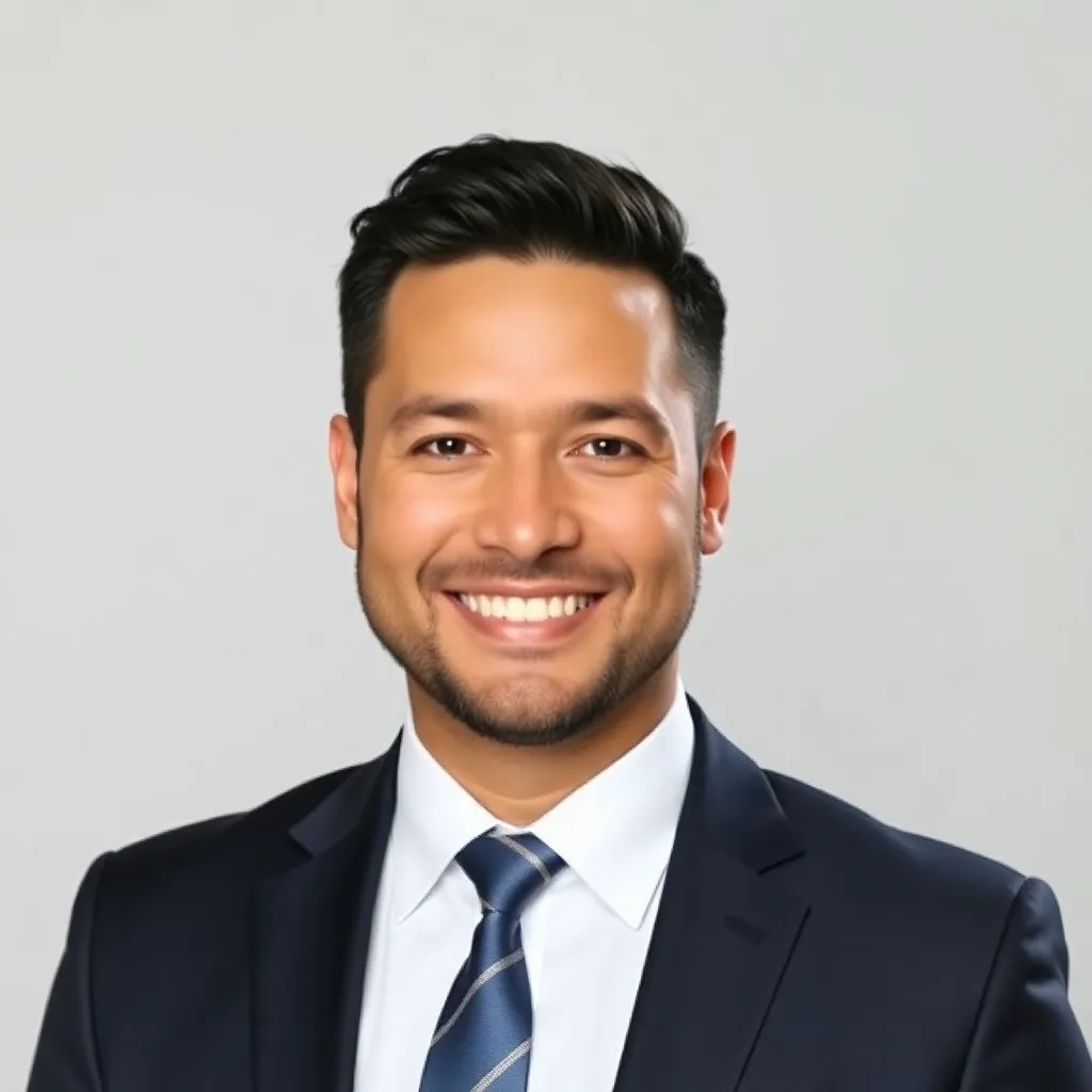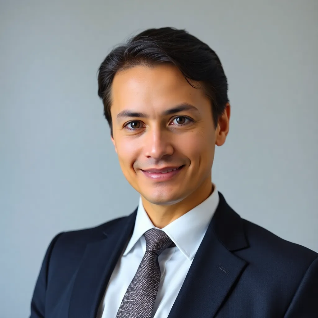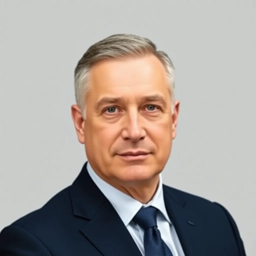 Create a professional headshot of a lawyer, aged 35-50, with a serious and confident expression. Wear a formal suit and tie, with a slight smile. Background should be a neutral or subtle gradient. Lighting should be soft and natural. Hair should be neatly trimmed and styled. Eyes should be sharp and focused.