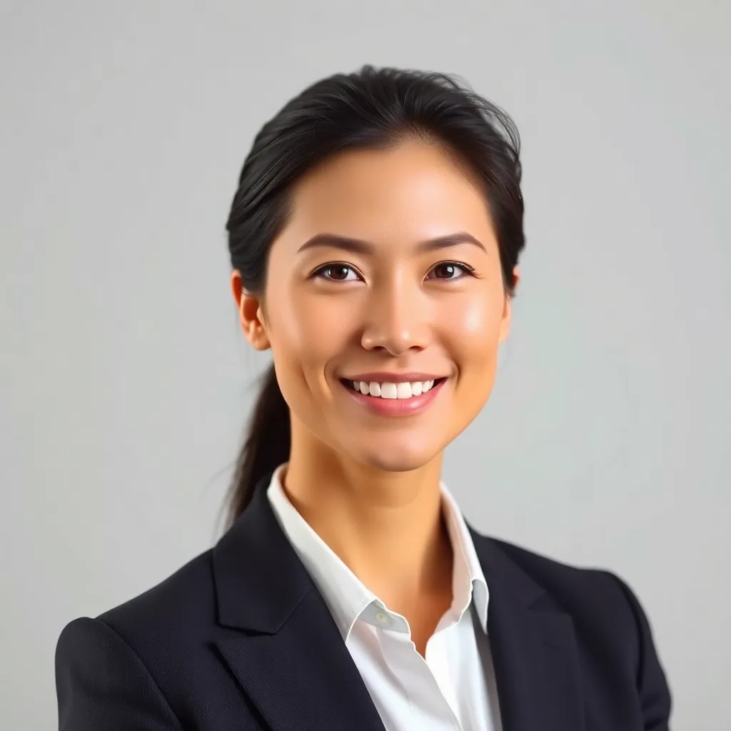 Create a professional lawyer headshot with a serious expression, wearing a tailored suit and a subtle smile. Set against a clean, neutral background, the image should convey confidence, expertise, and approachability. Hair should be styled neatly, and glasses or jewelry should add a touch of personality.