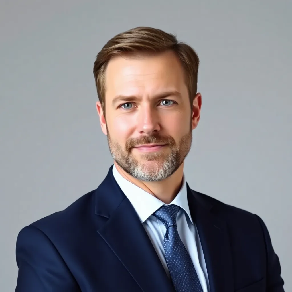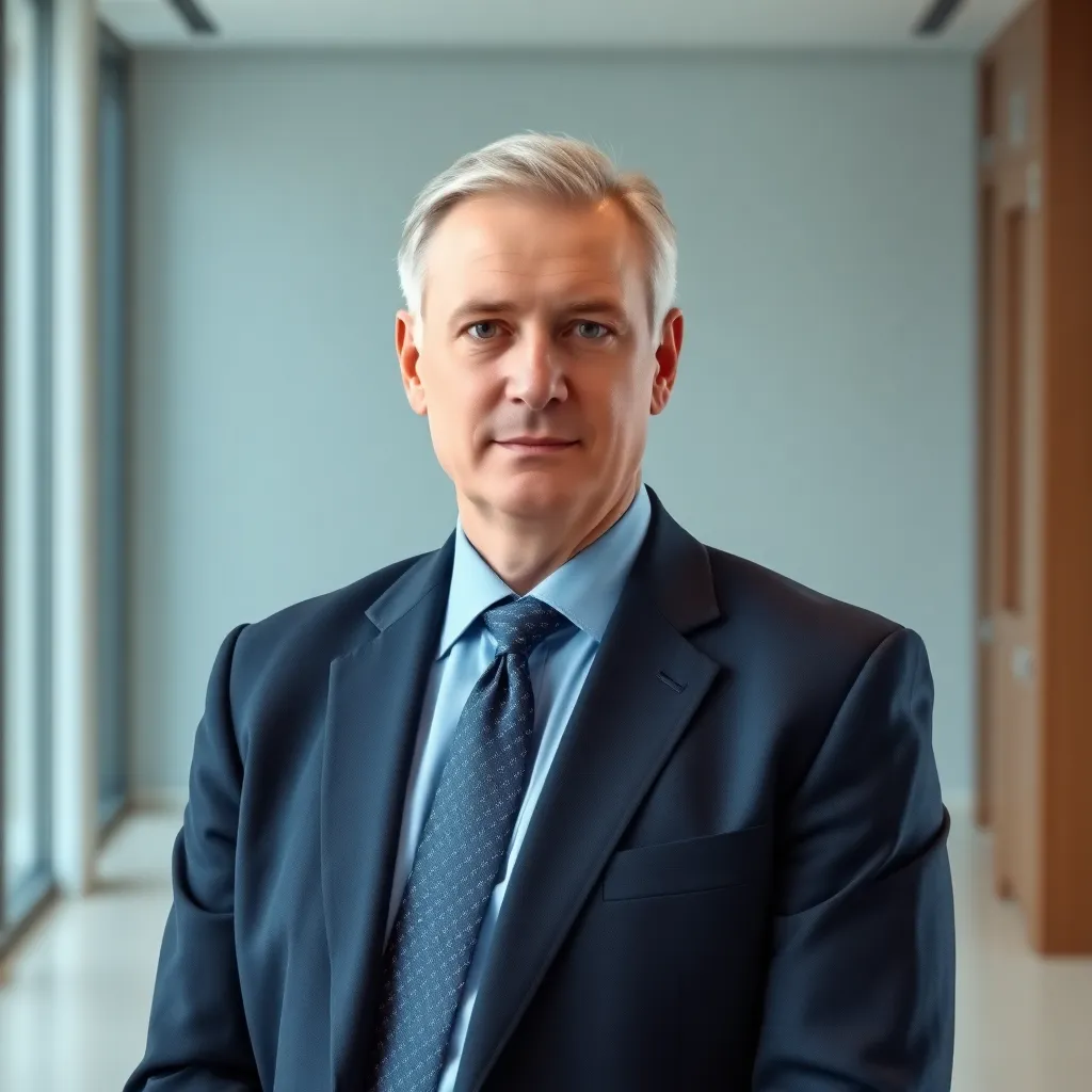 Create a professional headshot of a lawyer. The subject is a middle-aged man with a conservative haircut, wearing a navy blue suit and tie. He has a serious expression with a hint of confidence. The background is a subtle gradient of neutral colors. The image should convey trust, expertise, and authority.