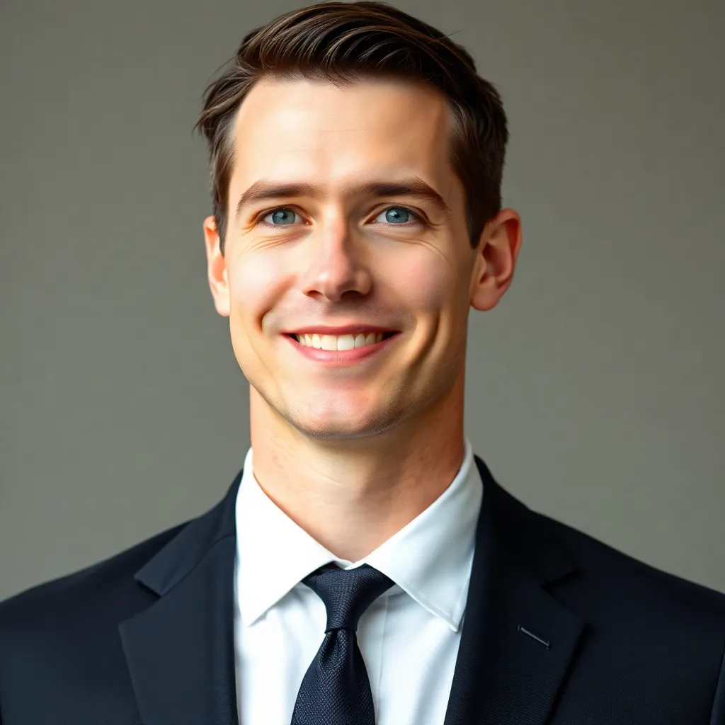 Create a professional headshot of a lawyer, showcasing a sharp, intelligent, and confident individual. Think tailored suit, crisp white shirt, and a hint of a smile. Background should be a subtle, neutral tone. Hair should be styled neatly, and facial features should be well-defined. Lighting should be soft and flattering.