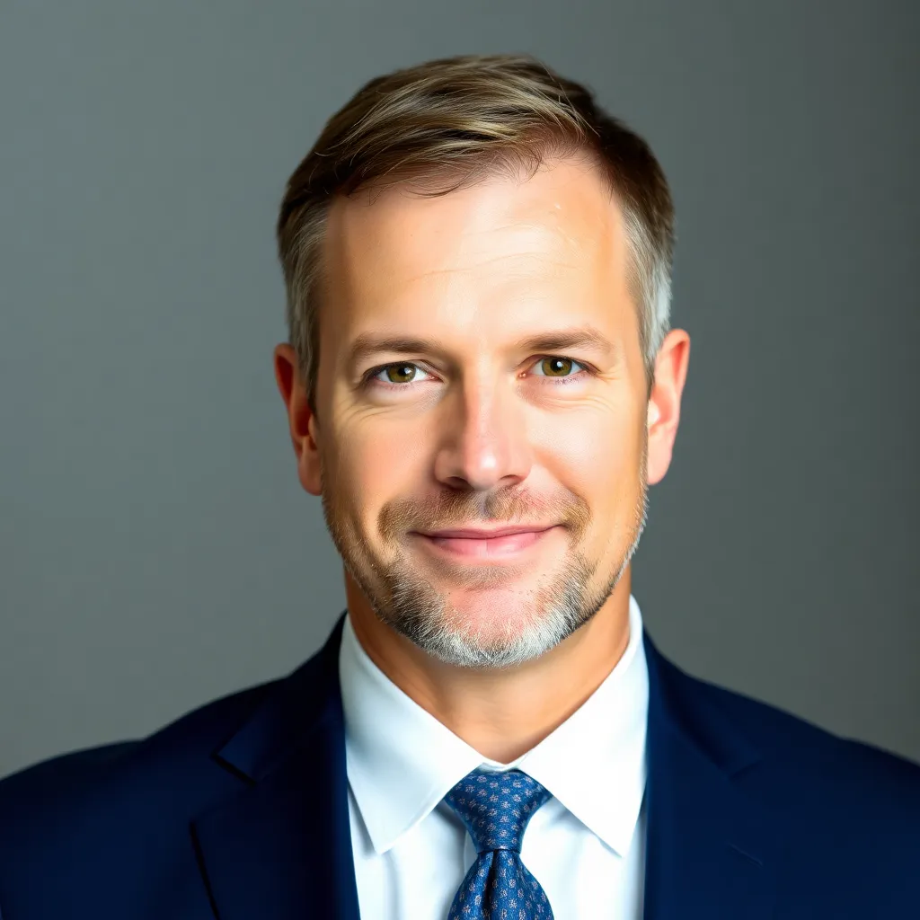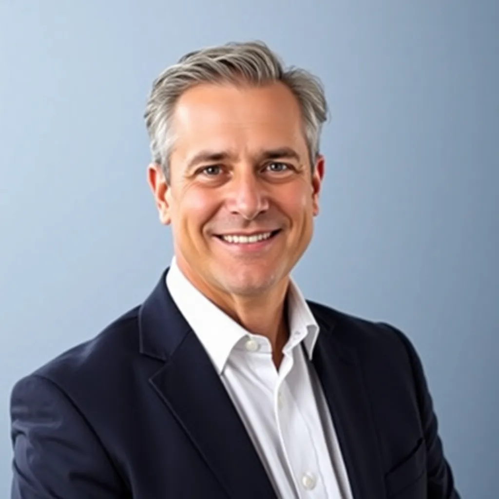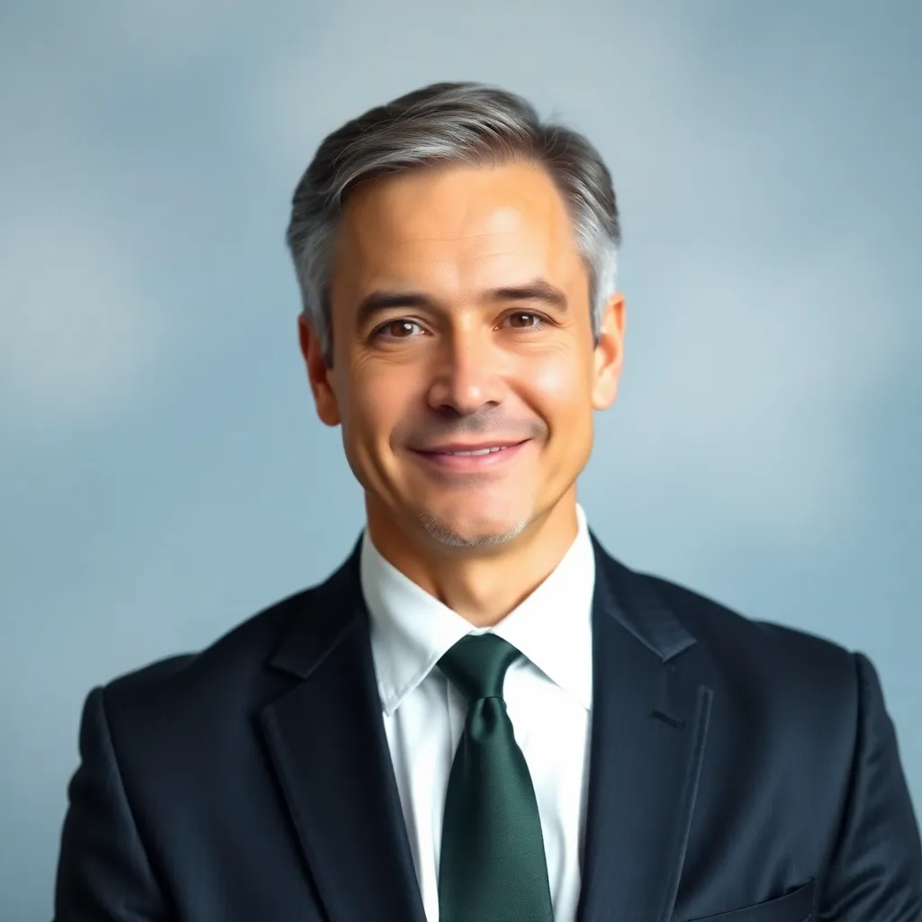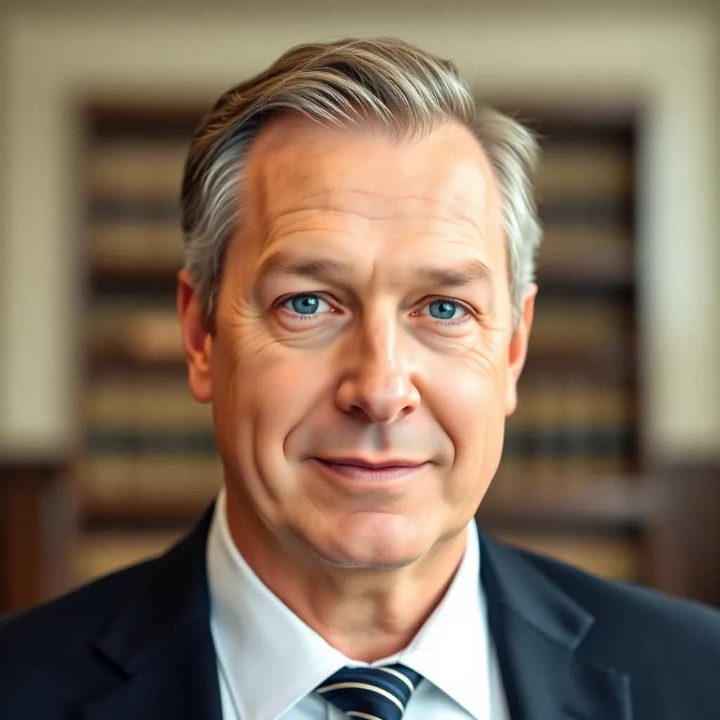 Create a professional headshot of a lawyer. The subject is a middle-aged man with a friendly yet authoritative expression, wearing a tailored suit and a crisp white shirt. The background is a subtle gradient of blues and whites, evoking a sense of trust and professionalism. The lighting is soft and natural.