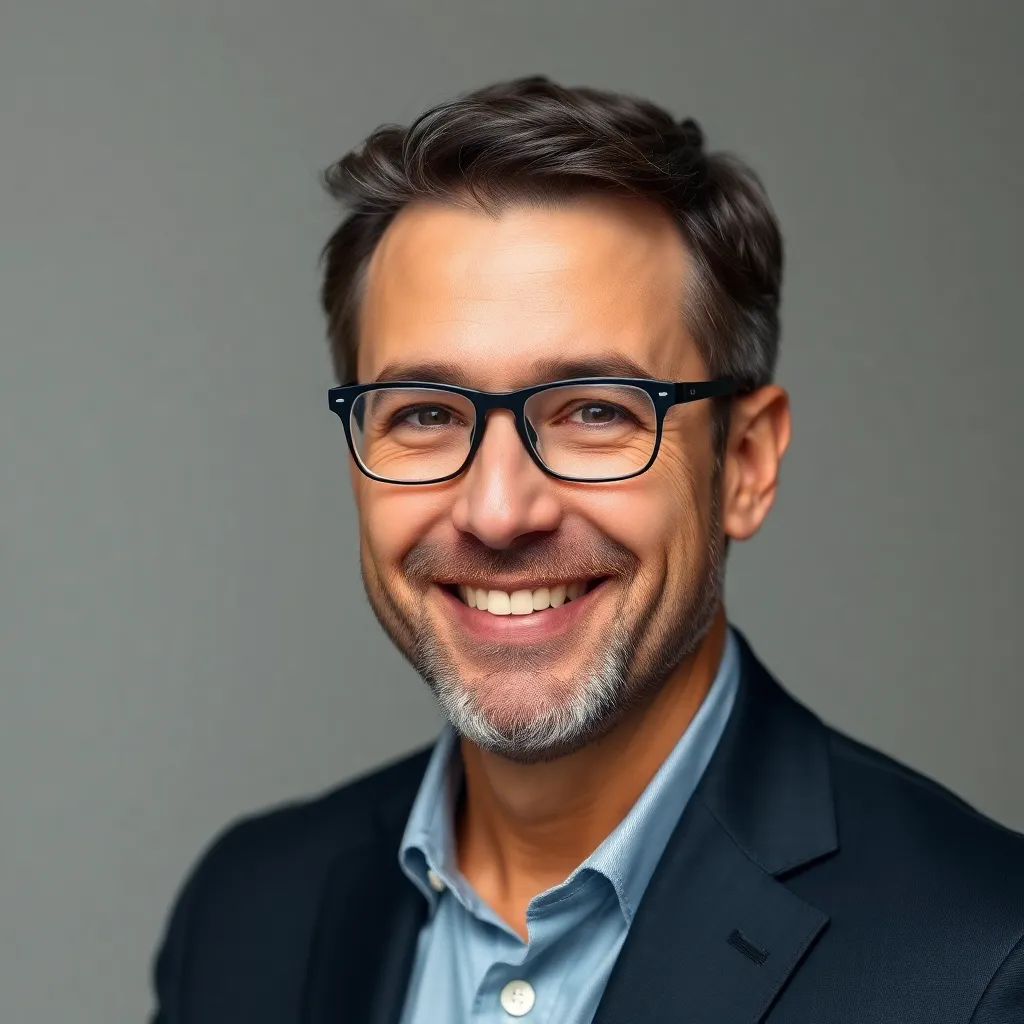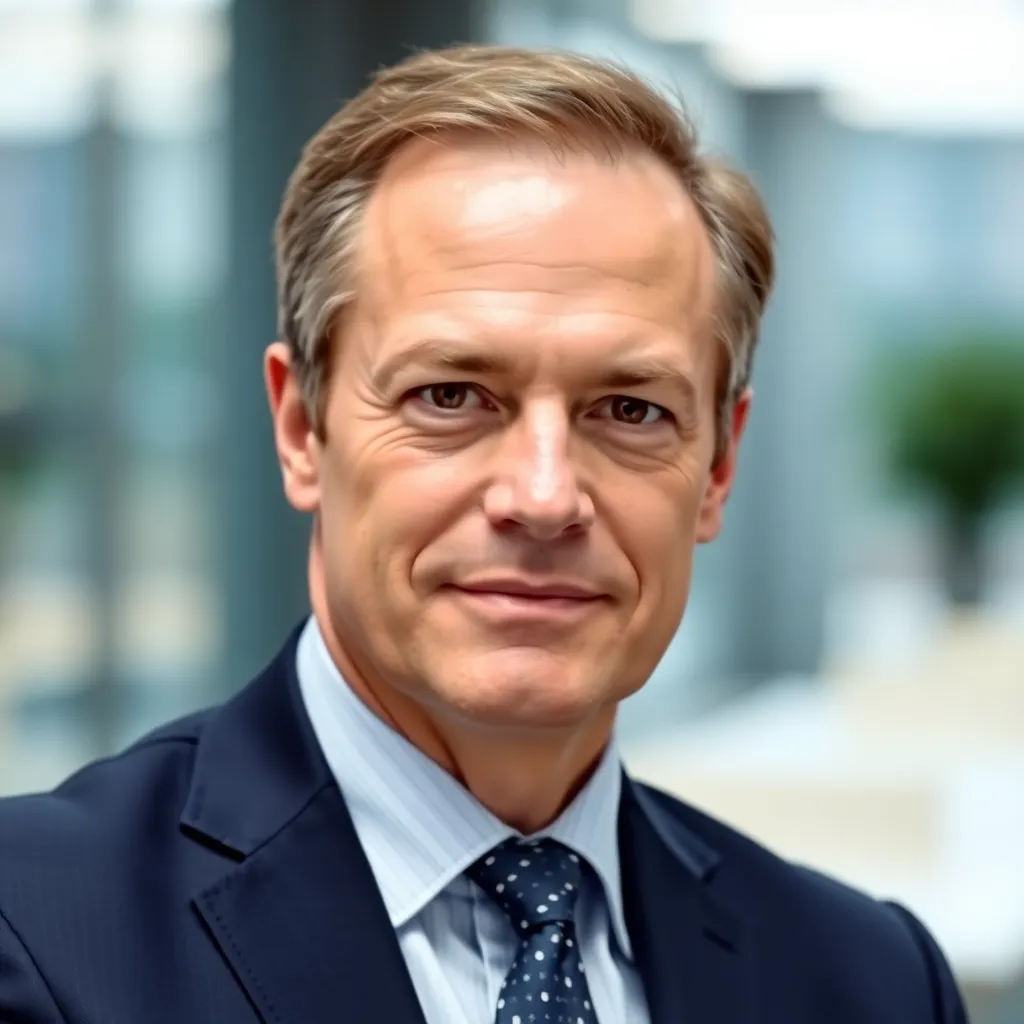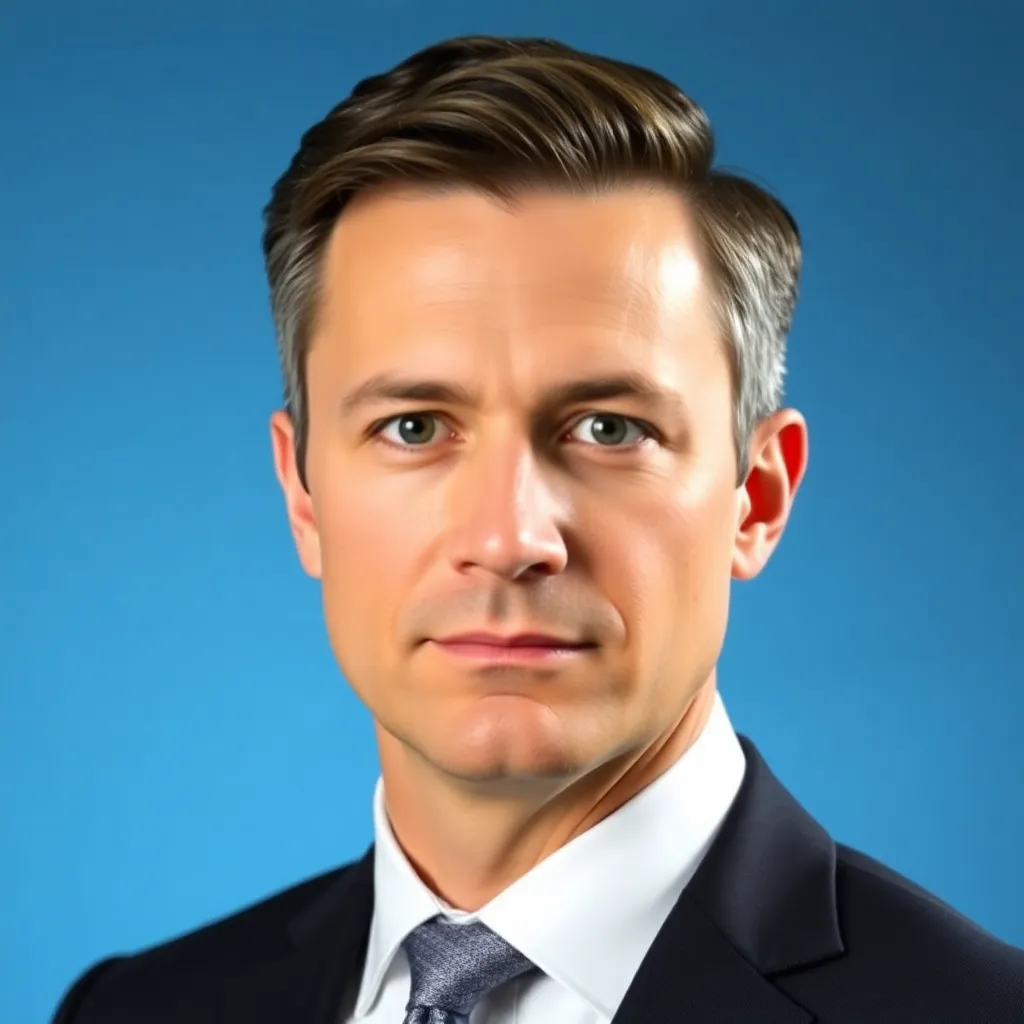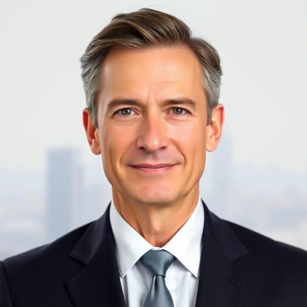 Create a professional headshot of a lawyer. The subject is a middle-aged man with a friendly yet authoritative expression, wearing a tailored suit and a crisp white shirt. The background is a subtle gradient of blues and whites, evoking a sense of trust and professionalism. The lighting is soft and natural.