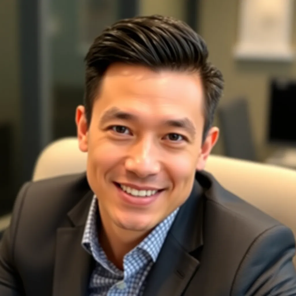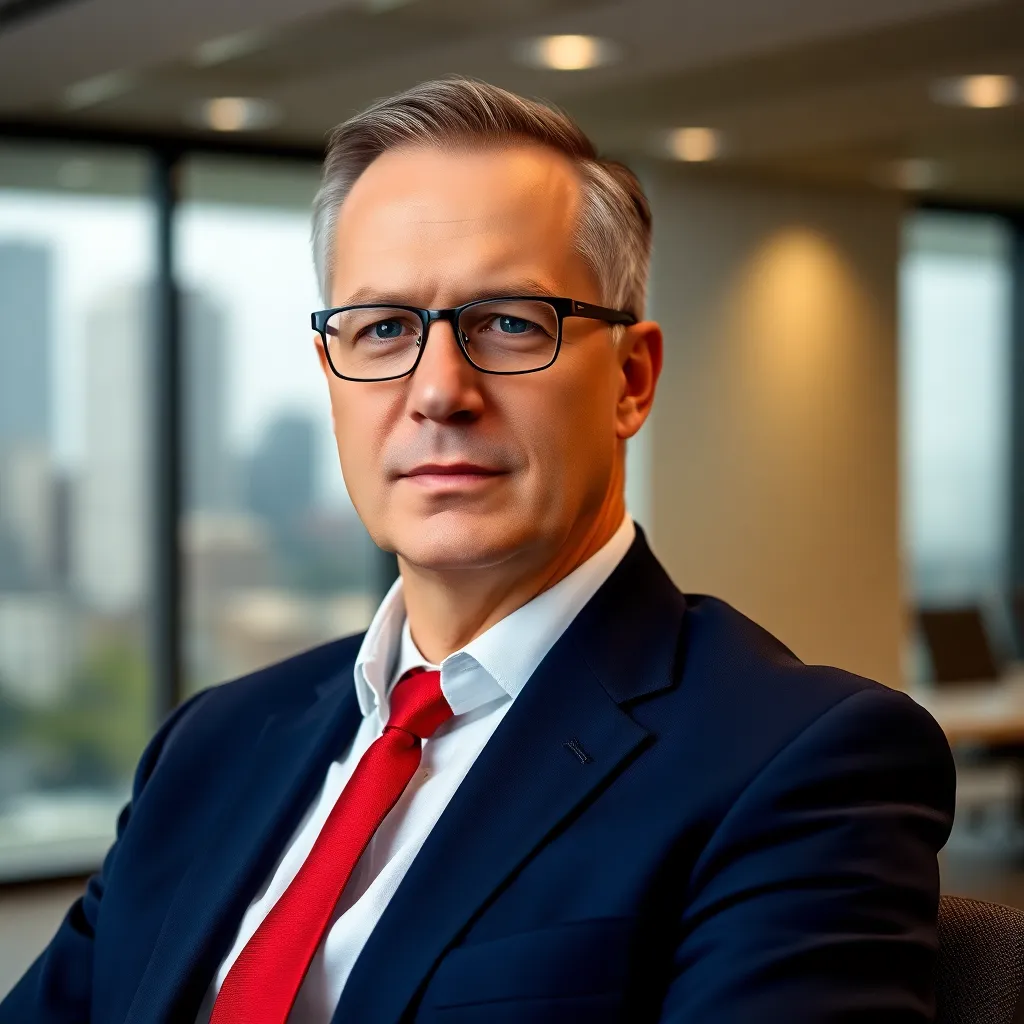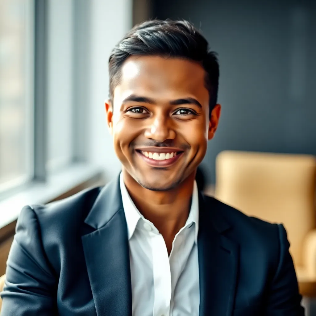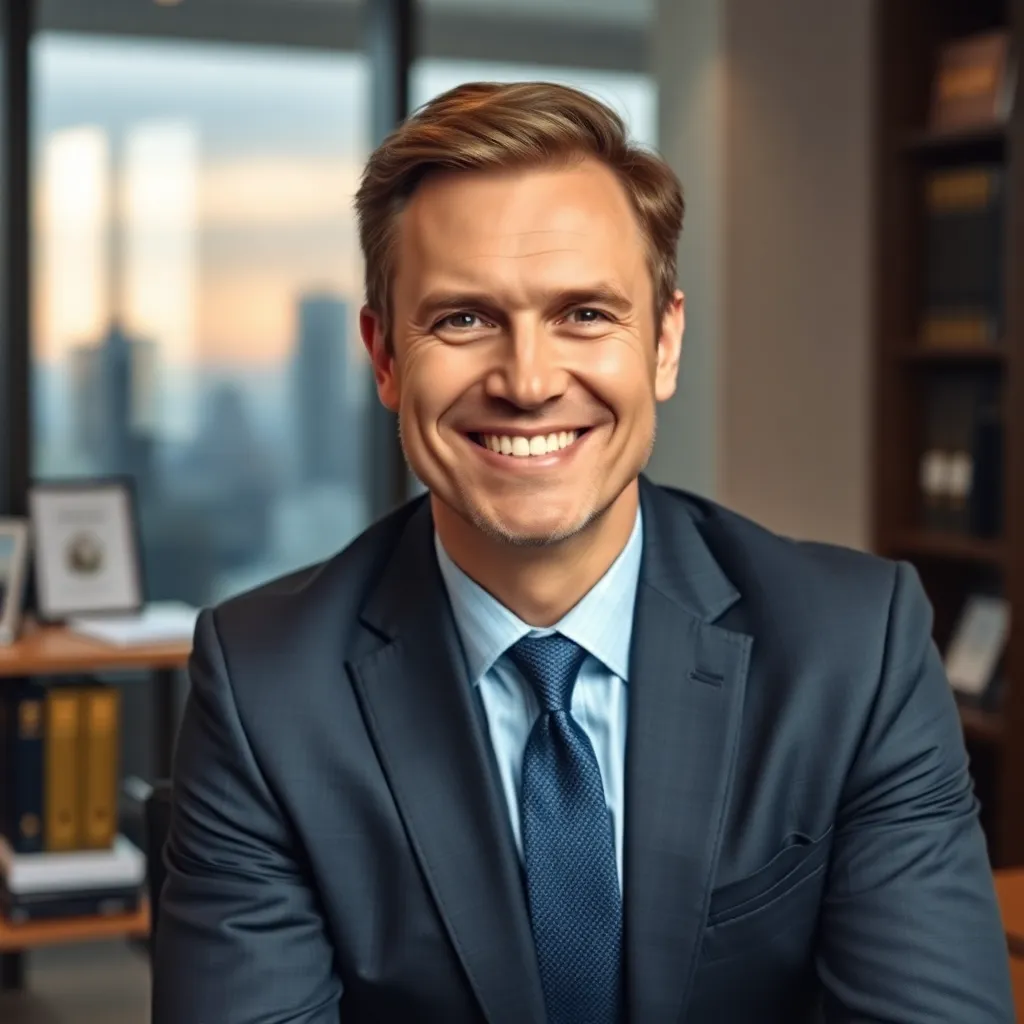 Create a professional headshot for a lawyer. Imagine a sharp-dressed individual with a confident smile, sitting in a modern office with a city skyline or a classic wood-paneled background. The lawyer should be looking directly at the camera with a hint of authority and approachability. Focus on capturing their personality.