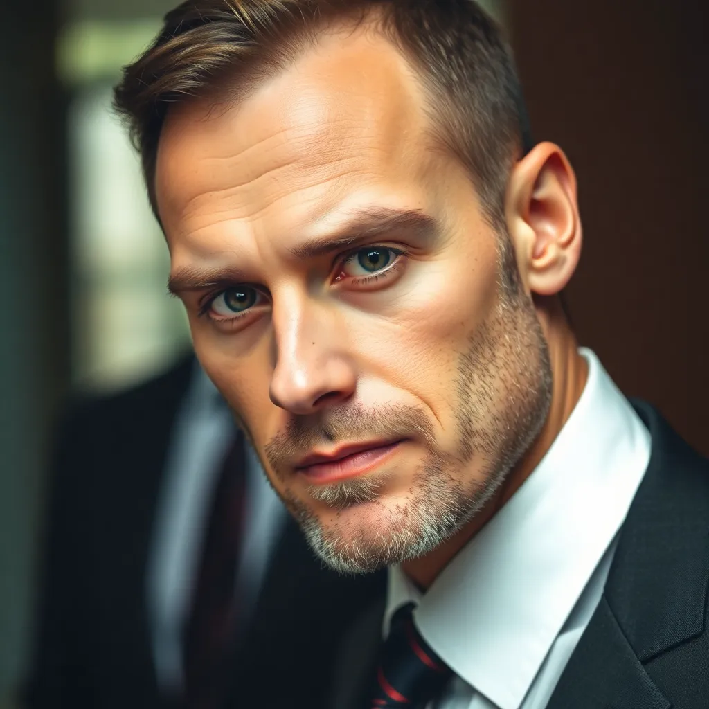 Create a professional lawyer headshot with a serious expression, showcasing a sharp jawline and piercing eyes. Set against a neutral background, the lawyer is dressed in a classic suit with a subtle pattern. A hint of a smile suggests a confident and approachable demeanor, conveying expertise and trustworthiness.