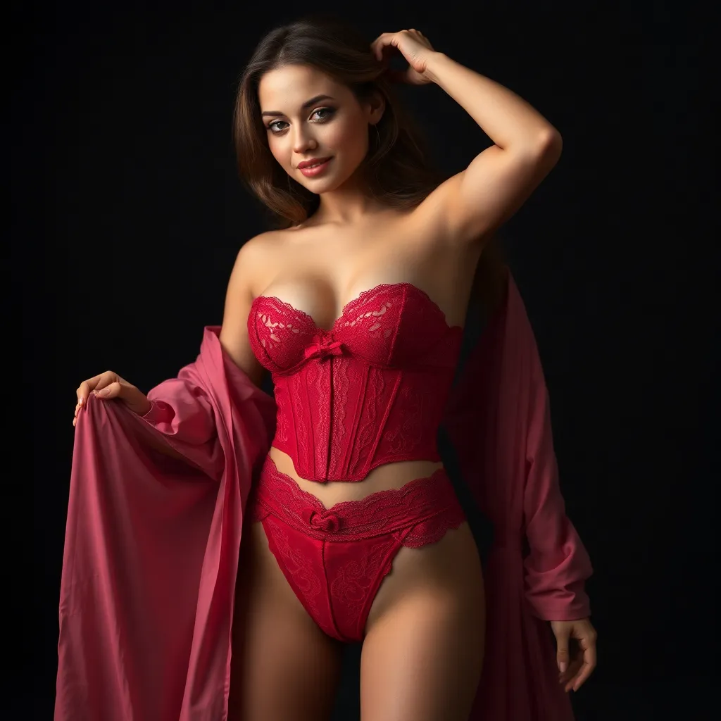 Create an AI-generated image of a stunning lingerie set featuring a lace-trimmed corset with delicate straps, paired with matching high-waisted briefs and a flowy chiffon robe. The model, a confident and sensual woman, poses in a dimly lit room with a soft focus on her face, radiating elegance and sophistication.