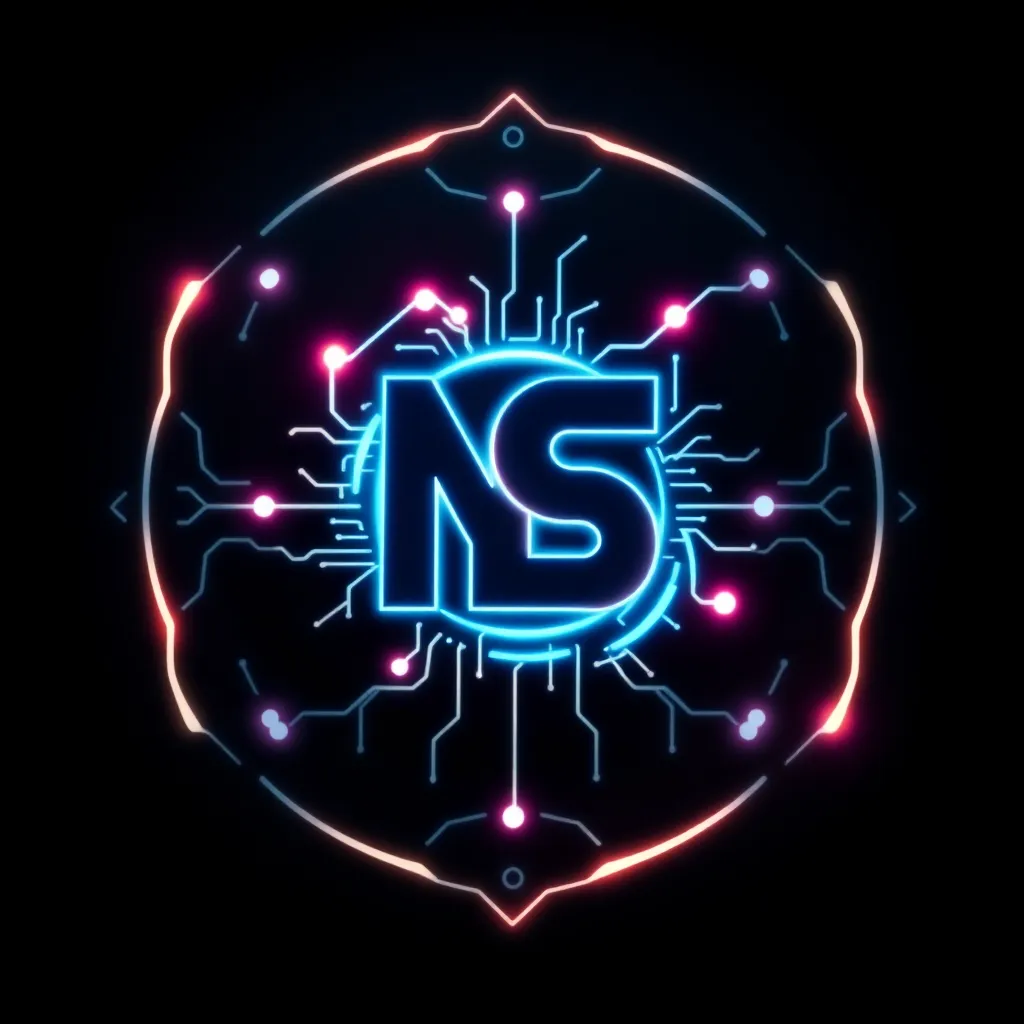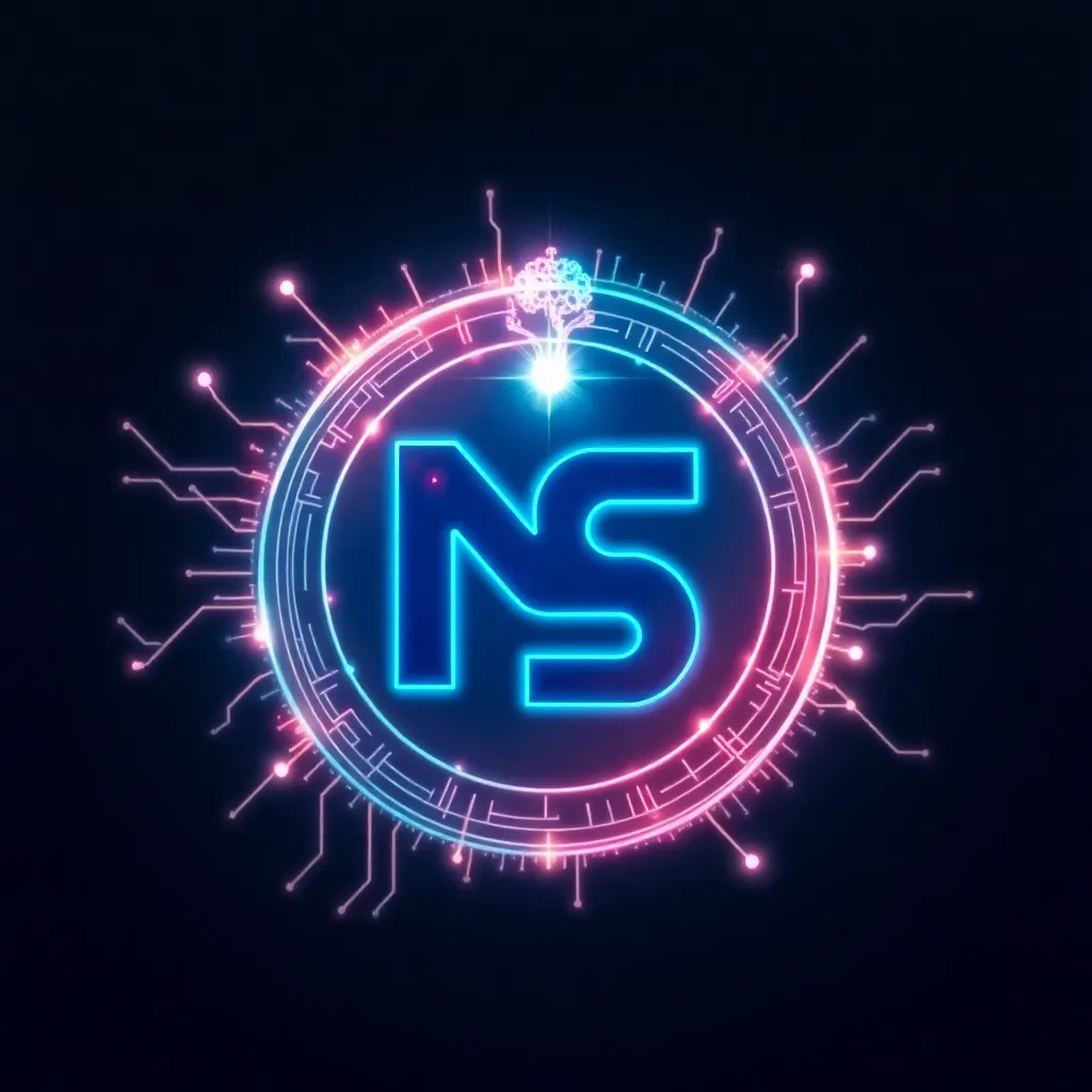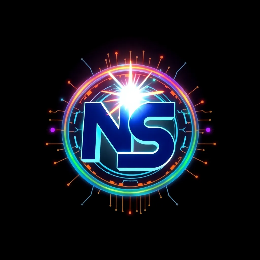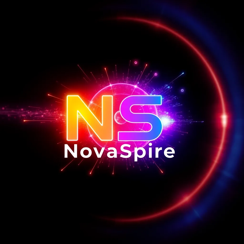 Create a dynamic logo animation for a futuristic tech company, 'NovaSpire'. The animation should start with a glowing nucleus, then expand to reveal a stylized 'NS' logo, followed by a trail of sparks and particles that swirl around the logo, finally ending with a bright, pulsing glow. Use vibrant neon colors and 3D effects.