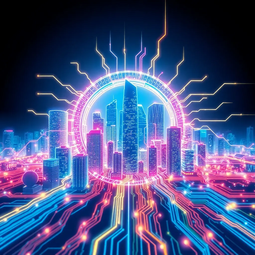 Create a logo animation that showcases a futuristic cityscape transforming into a vibrant, electric circuit board. Incorporate neon lights, glowing wires, and pulsing circuits to convey innovation and technology. The animation should be mesmerizing, futuristic, and attention-grabbing, perfect for a cutting-edge tech company or startup.