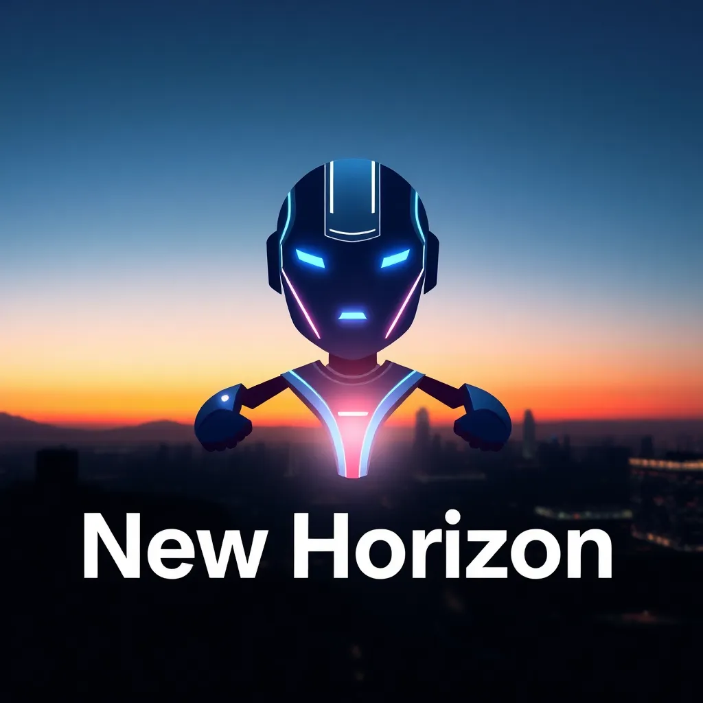 Create a logo animation that showcases a futuristic cityscape at dawn, with a sleek, glowing robot emerging from the horizon, its LED lights illuminating the dark sky as it transforms into a vibrant, pulsing cityscape, symbolizing innovation and progress, with a bold, dynamic font announcing 'New Horizon'.