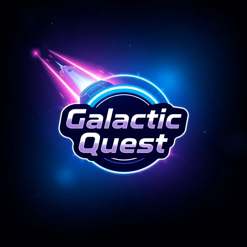 Create a logo animation for a futuristic space travel company, 'Galactic Quest'. The animation should feature a stylized spaceship soaring through the galaxy, with neon lights and sparks trailing behind. The logo should be prominently displayed at the center of the animation, with a bold font and a sense of movement.