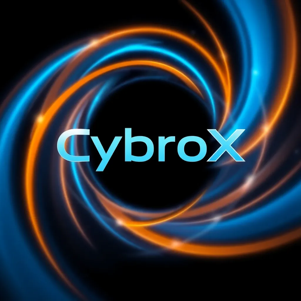 Create a dynamic logo animation for a futuristic tech company, 'CybroX', showcasing a swirling vortex of blue and orange colors, with sleek lines and geometric shapes. The animation should begin with a simple logo, gradually transforming into a 3D model, with pulsing lights and a sense of energy and movement.
