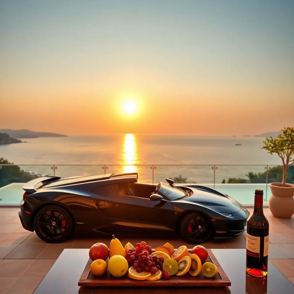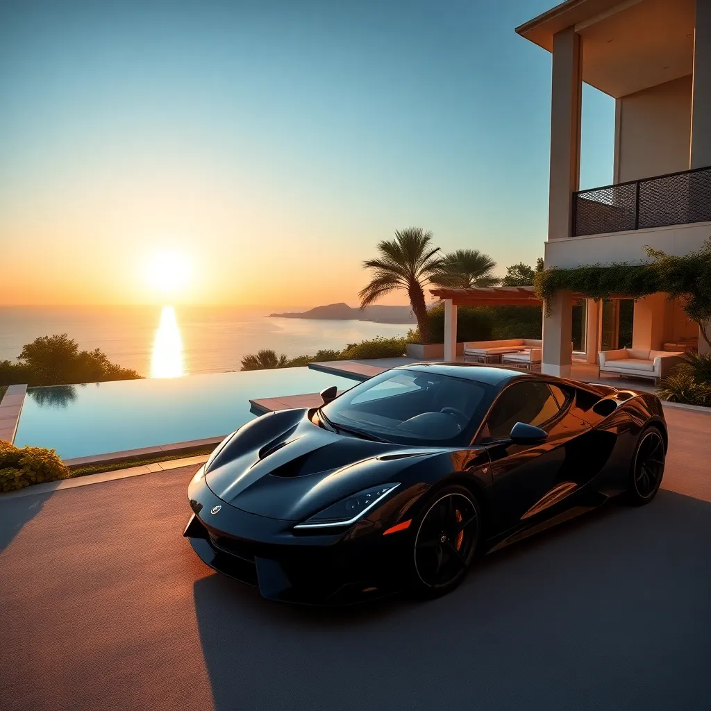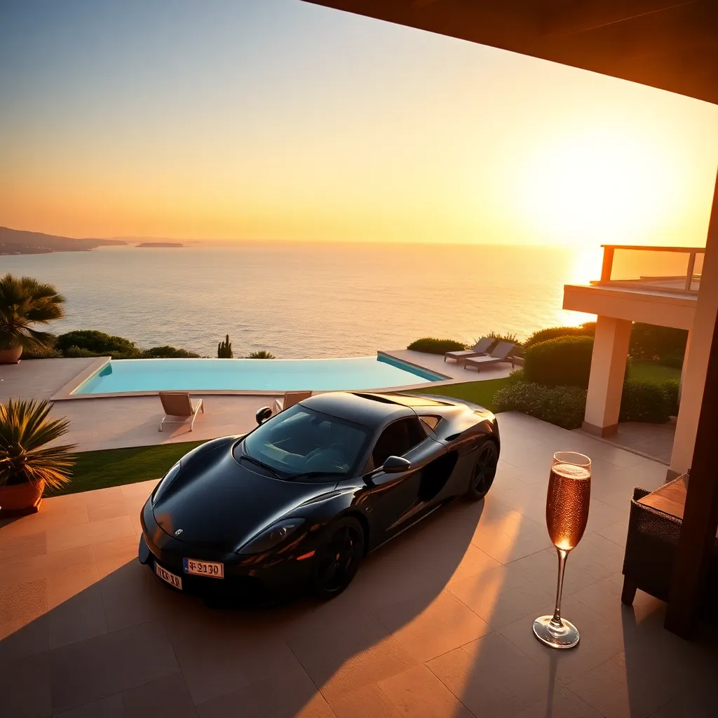Imagine a serene evening in a luxurious villa overlooking the Mediterranean Sea. A warm golden glow illuminates the private pool and lush gardens, while a sleek, black sports car is parked by the entrance. A chilled glass of champagne awaits on the sun-kissed patio, surrounded by the soothing sounds of the ocean.