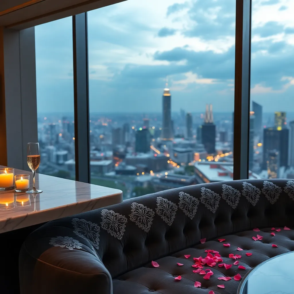 Envision a serene evening in a lavish penthouse suite overlooking the city skyline. Softly lit candles flicker on the marble-topped bar, where a chilled glass of champagne awaits. A plush velvet couch beckons, adorned with delicate lace and a sprinkle of rose petals. The scent of jasmine wafts through the air.