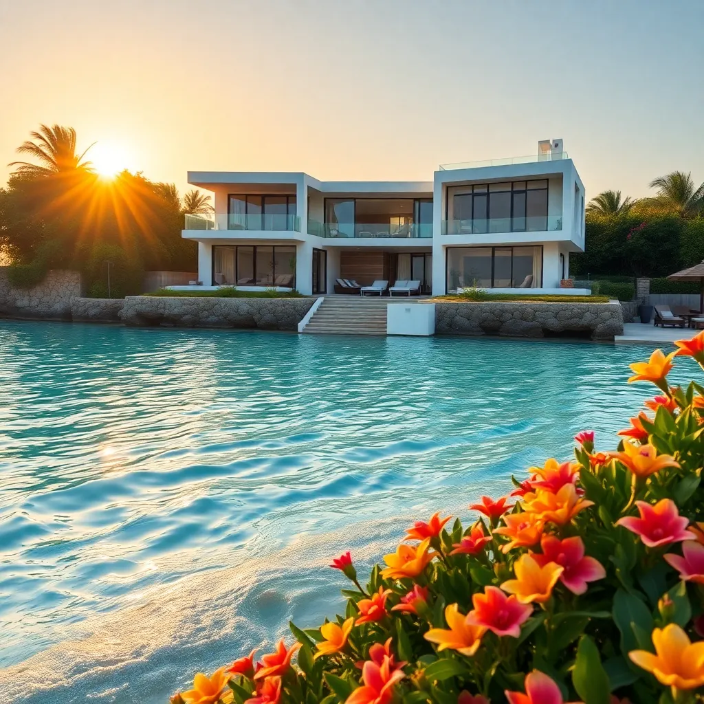 Imagine a serene and opulent beachside retreat, where crystal-clear waters lap against the shore and a sleek, modern villa stands tall. The sun sets slowly, casting a warm golden glow over the scene. Surrounding the villa, lush greenery and vibrant flowers bloom, filling the air with sweet scents and tranquility.