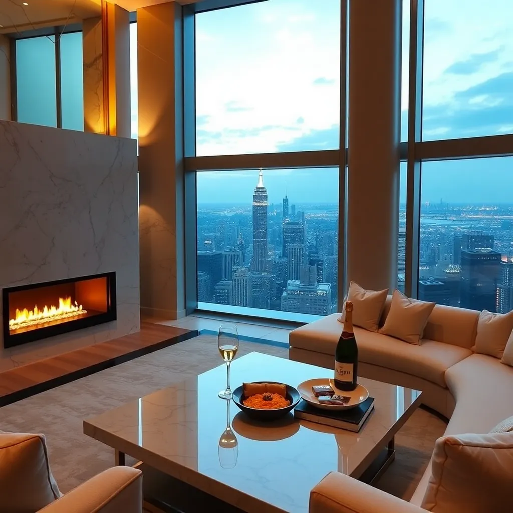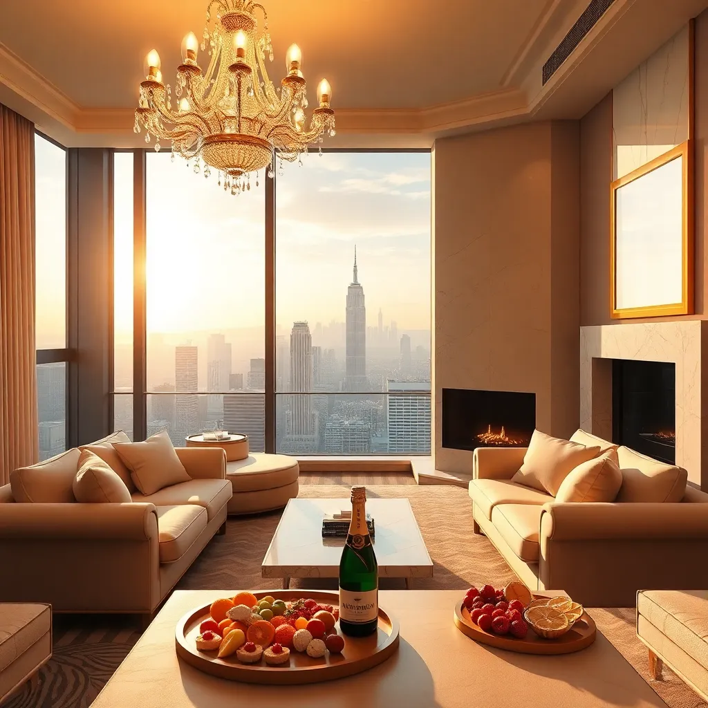 Imagine a lavish penthouse suite with floor-to-ceiling windows overlooking the city skyline. Soft, golden lighting illuminates plush, cream-colored furnishings and a stunning marble fireplace. A champagne and caviar service is set on a sleek, modern coffee table. A private balcony beckons, with a breathtaking view of the glittering city below.