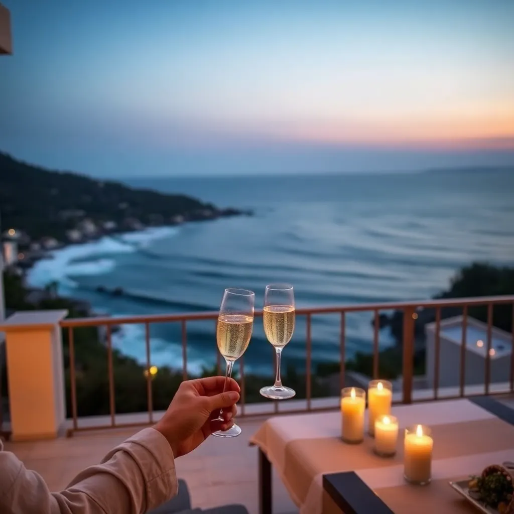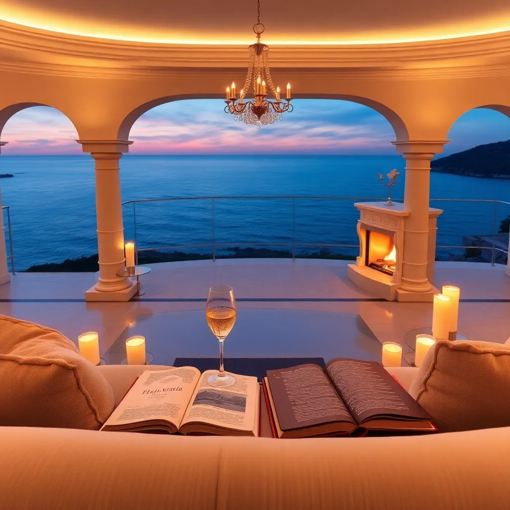 Imagine a serene evening in a lavish villa overlooking the Mediterranean Sea. A champagne toast is being served on the private deck, accompanied by the soft glow of candles and the soothing sound of waves crashing against the shore. Capture the essence of luxury and tranquility in this idyllic setting.