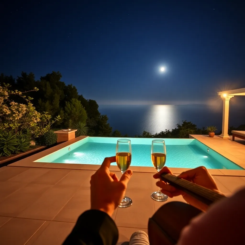 Imagine a serene evening at a luxurious villa overlooking the Mediterranean Sea. A private infinity pool sparkles under the stars, surrounded by lush greenery and a subtle mist. A champagne toast awaits on the moonlit patio, accompanied by the soft strumming of a guitar. Capture the essence of opulence and relaxation.