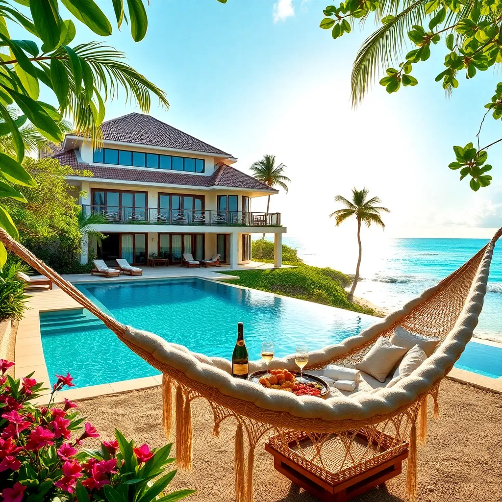 a lavish villa overlooking crystal-clear waters, surrounded by lush greenery and vibrant flowers. A private infinity pool glimmers in the sunlight, while a plush, oversized hammock beckons relaxation. A champagne toast and gourmet picnic await on the secluded beach, as the sun sets on a luxurious day.