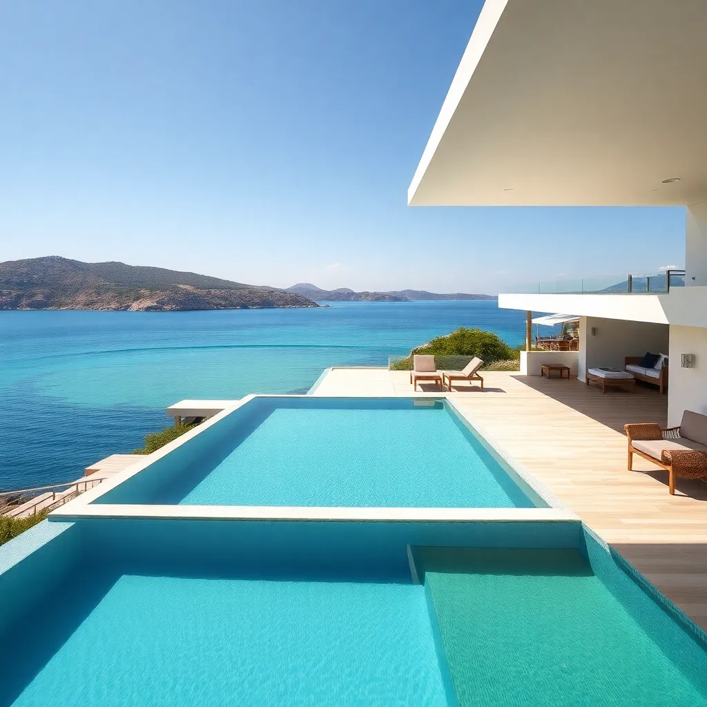 Imagine a serene afternoon in a lavish villa overlooking the Mediterranean Sea. A private infinity pool sparkles in the sunlight, surrounded by lush greenery and sleek, modern architecture. A plush lounge chair beckons, accompanied by a chilled glass of champagne and a succulent fruit platter. Capture the epitome of luxury.