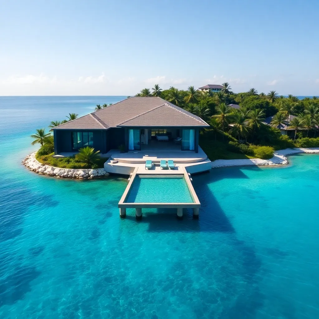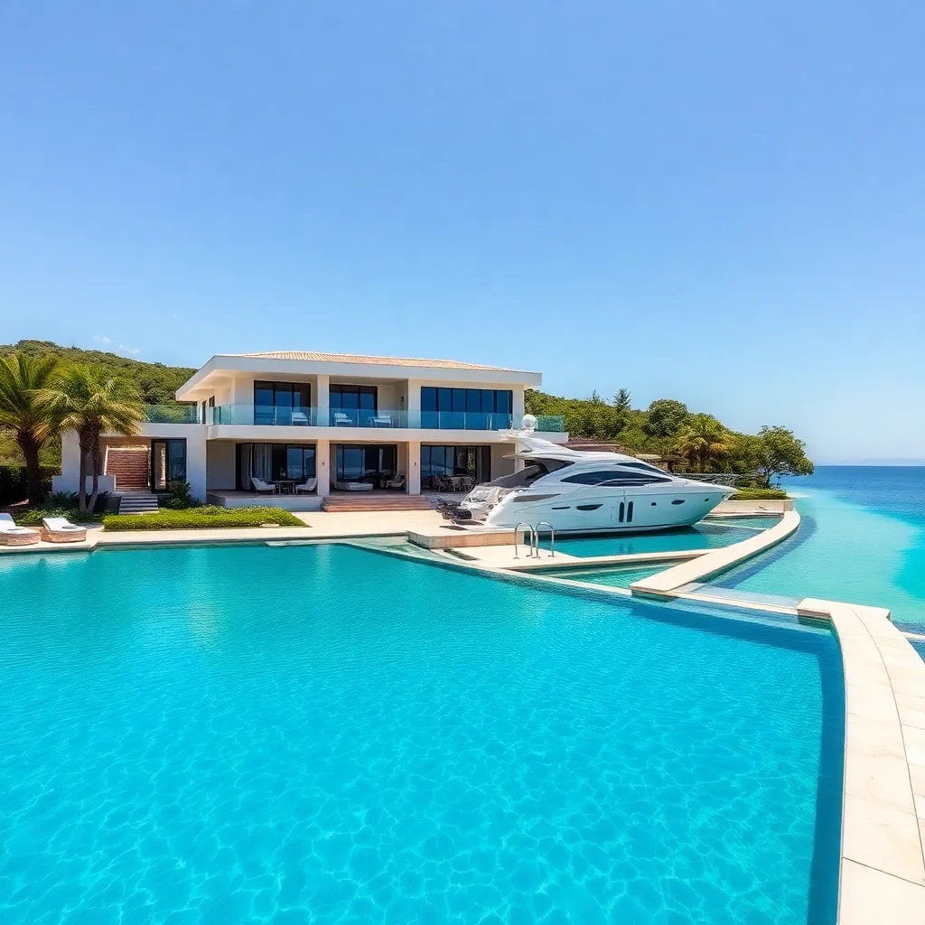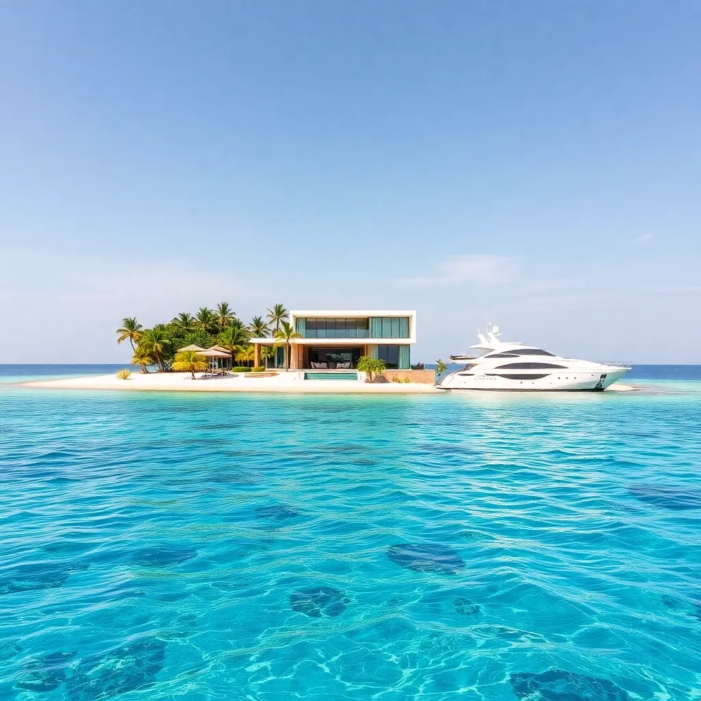 Imagine a serene, tropical oasis, where crystal clear waters lap against the shore of a private island. A sleek, modern villa stands proudly, its infinity pool blending seamlessly into the ocean. A luxurious yacht awaits offshore, ready to whisk you away to a day of snorkeling or simply basking in the sun.