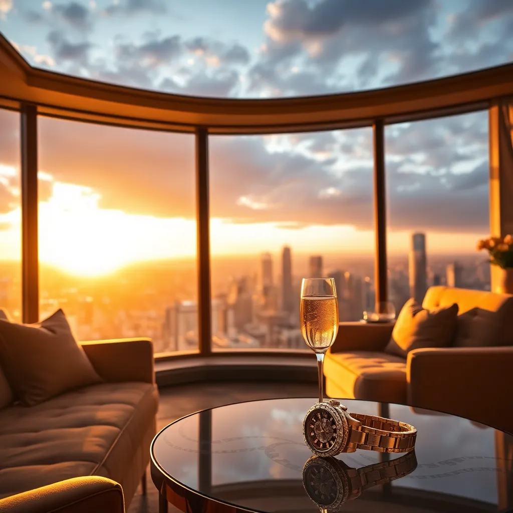 Imagine a serene and sophisticated evening in a lavish penthouse suite overlooking the city skyline. The room is bathed in warm golden light, with plush velvet sofas and marble accents. A champagne flute and diamond-encrusted watch lie elegantly on a glass coffee table. Create a stunning AI image that captures this opulent scene.