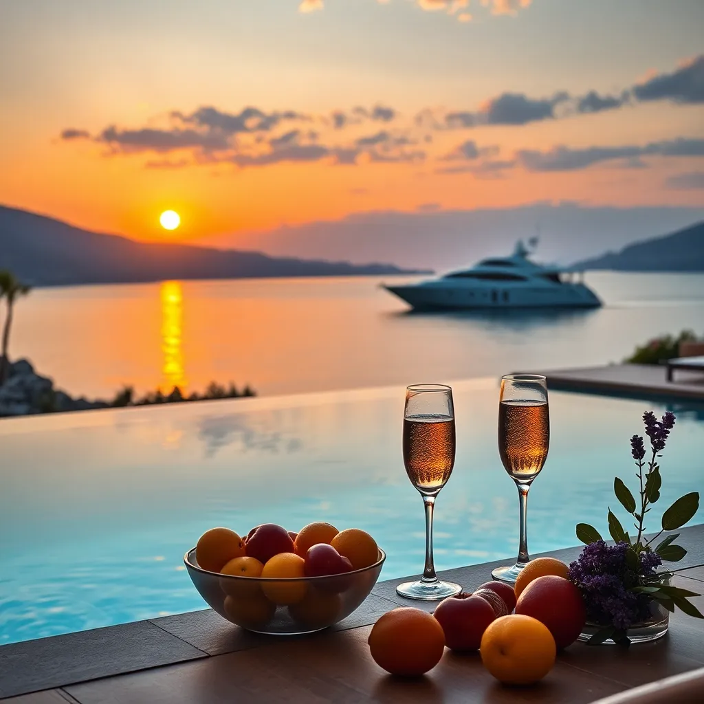 Imagine a serene evening in a lavish Mediterranean villa. A warm golden glow casts a spell over the infinity pool, where champagne flutes and succulent fruits await. The aroma of fresh lavender and lemons wafts through the air, as a sleek yacht glides silently into the nearby harbor. Capture the essence of opulence.