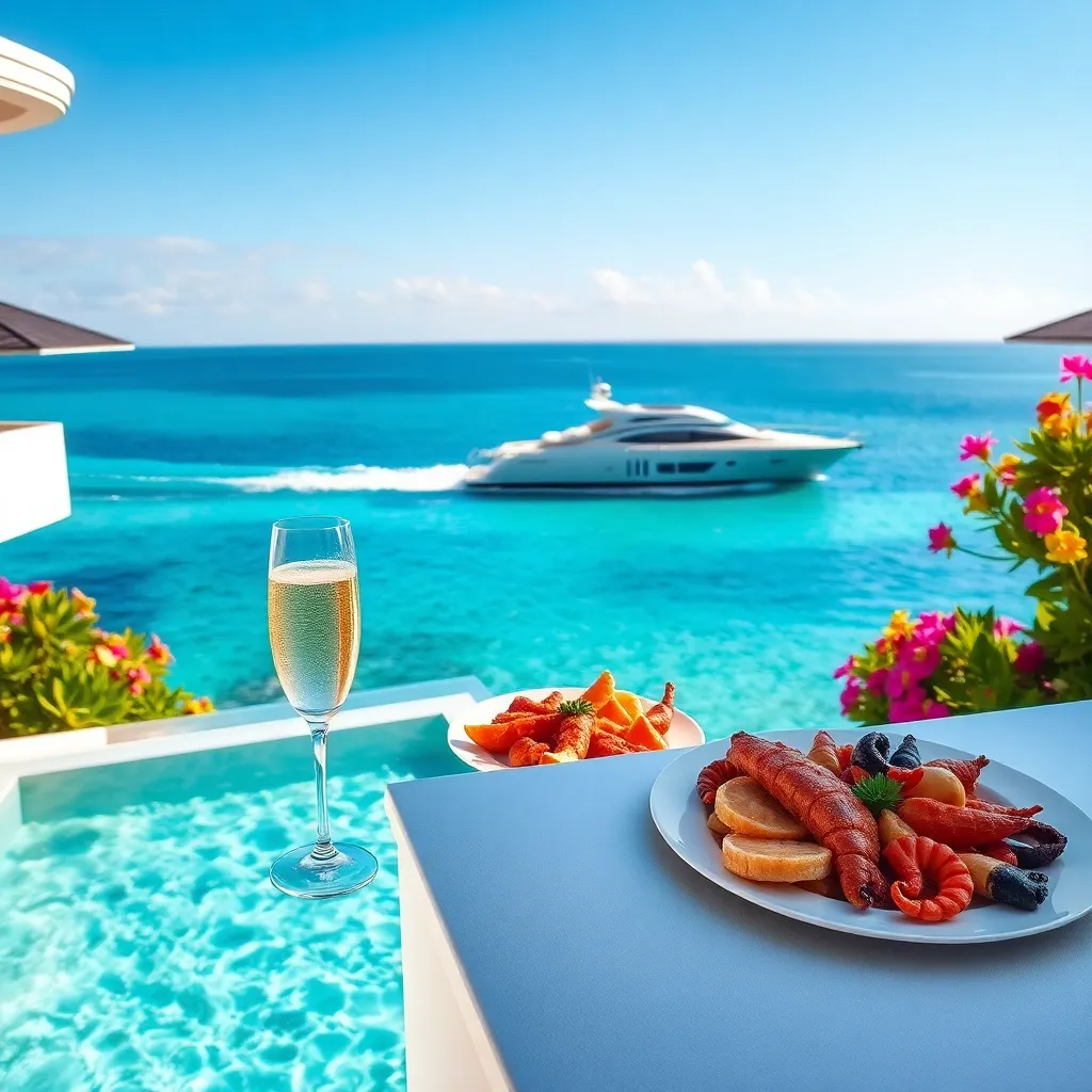 a private villa overlooking crystal-clear waters, surrounded by lush greenery and vibrant flowers. A sleek, silver yacht glides across the horizon. A champagne glass and a plate of succulent seafood await on the sun-kissed deck. Capture the essence of opulence and relaxation in this idyllic setting.