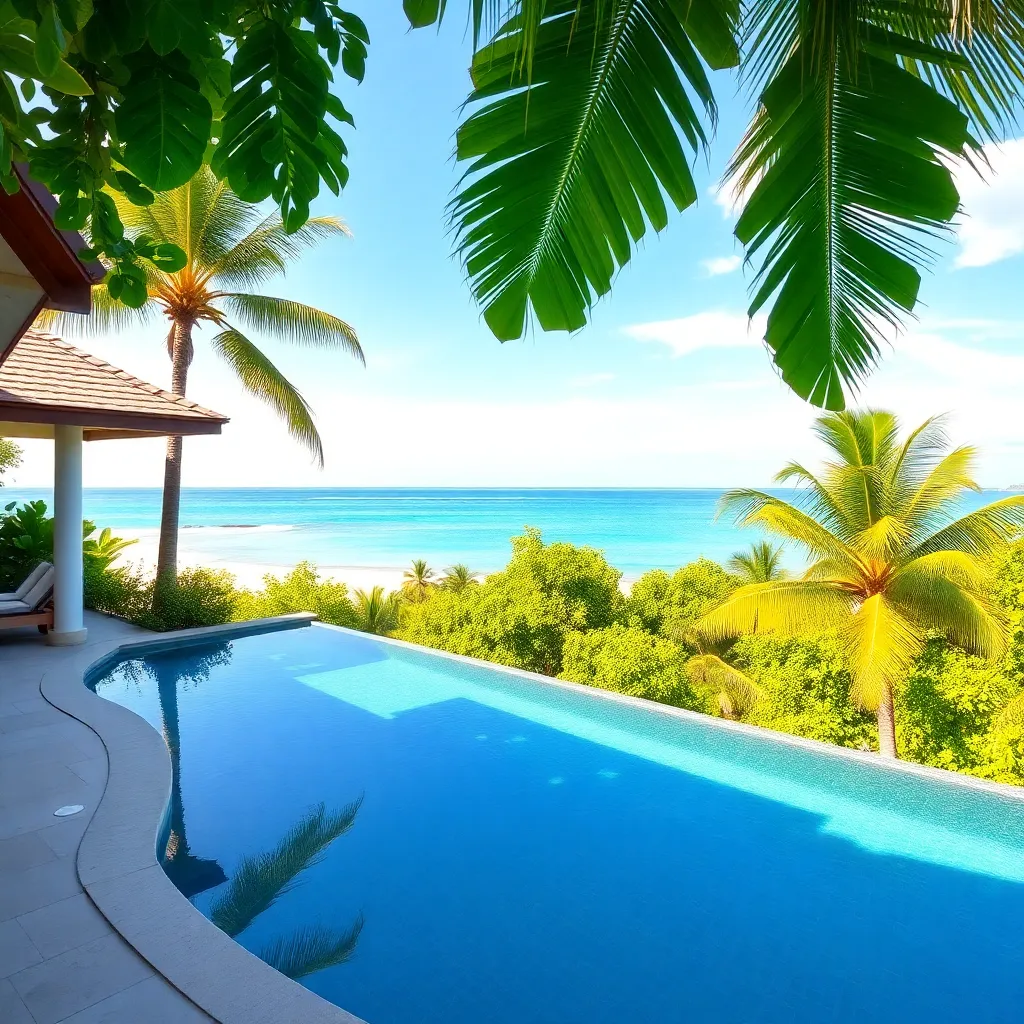 Imagine a serene and sophisticated retreat in the heart of a tropical paradise. A luxurious villa with a private infinity pool, surrounded by lush greenery and overlooking the crystal-clear ocean. A pampering spa, an infinity pool, and a private beach await. What does this idyllic getaway look like?