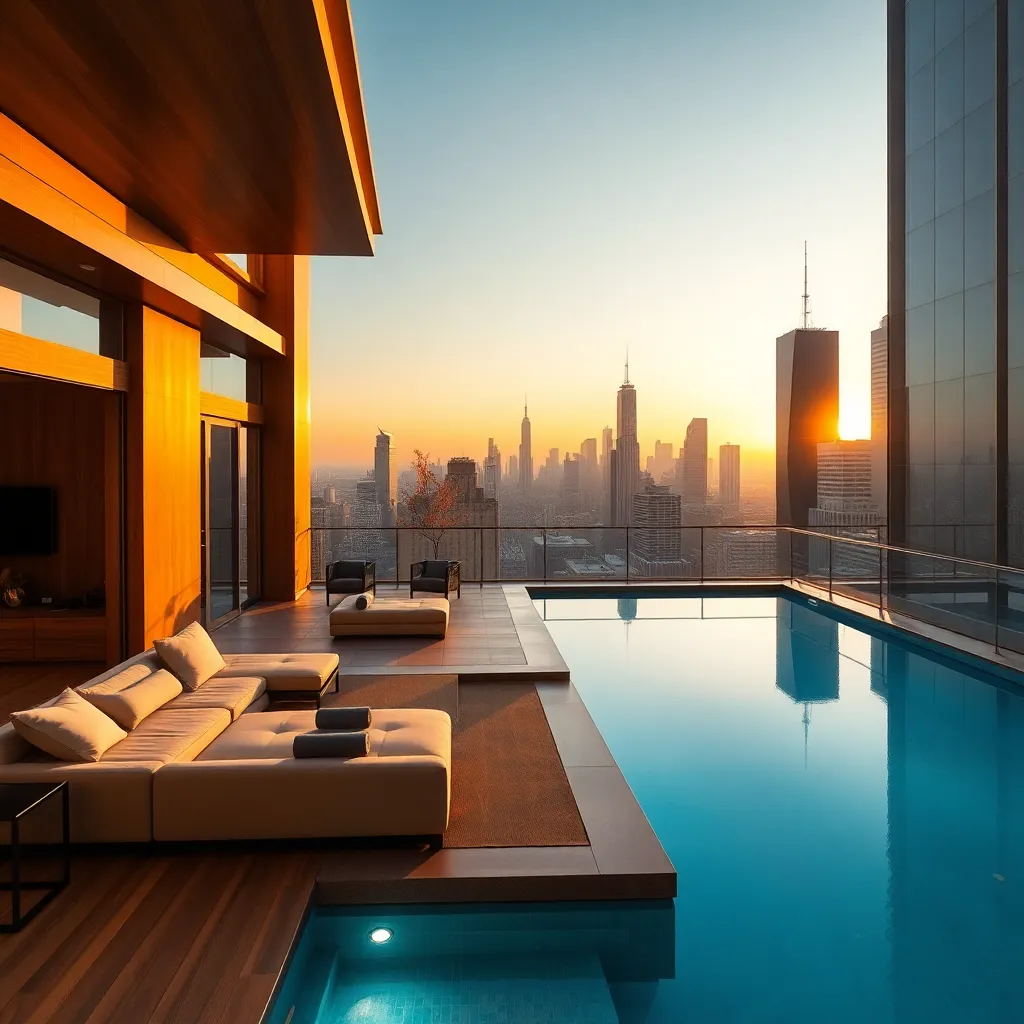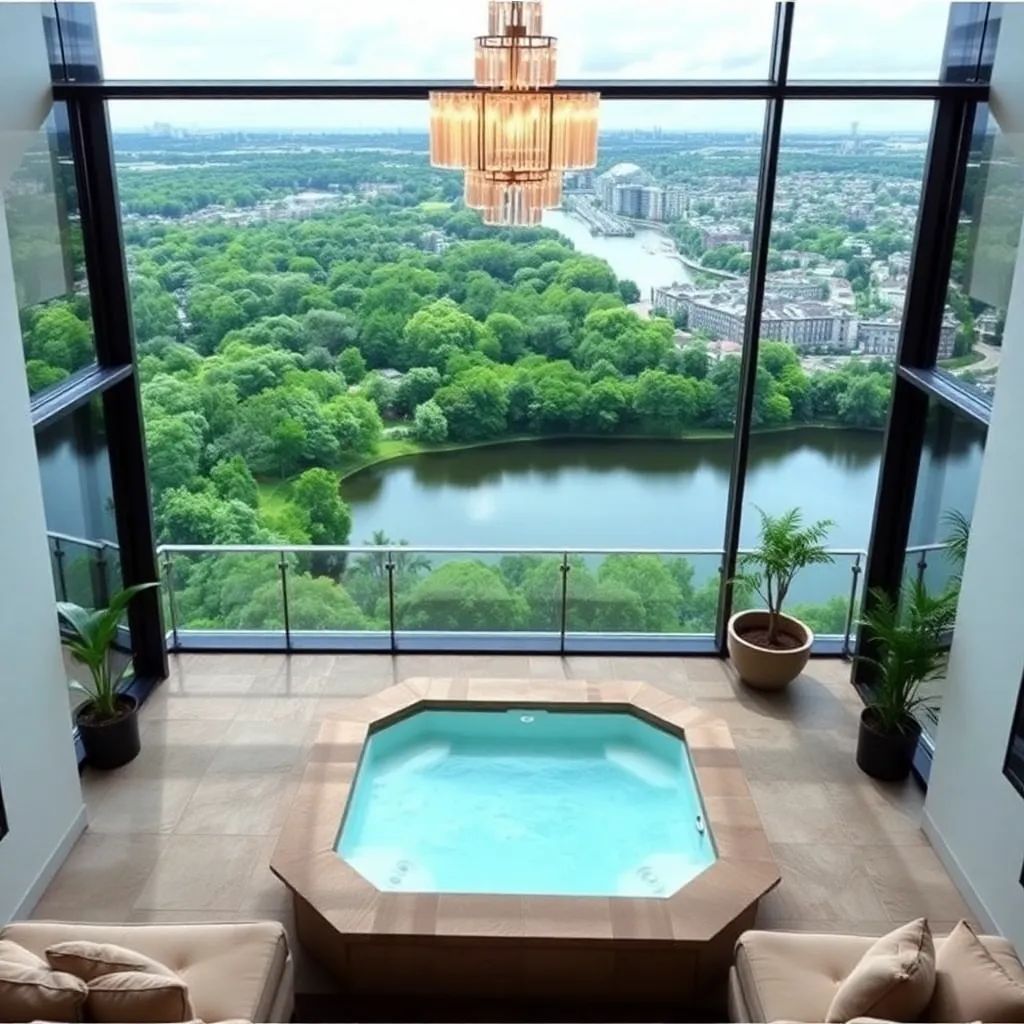 Imagine a serene oasis in the heart of a bustling city. A luxurious penthouse suite with floor-to-ceiling windows overlooking a tranquil lake, surrounded by lush greenery. The interior design is sleek and modern, with plush furnishings and a statement chandelier. A private balcony with a hot tub and city views.