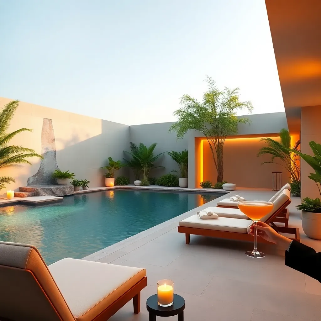 Create an AI-generated image of a luxurious spa retreat, featuring a serene poolside oasis with plush lounge chairs, a waterfall, and lush greenery. Incorporate warm, golden lighting and a modern minimalist architecture. Add a few strategically placed candles and a refreshing cocktail being served to complete the tranquil ambiance.